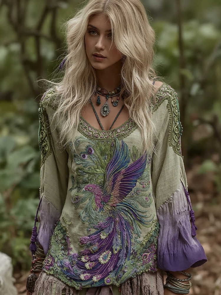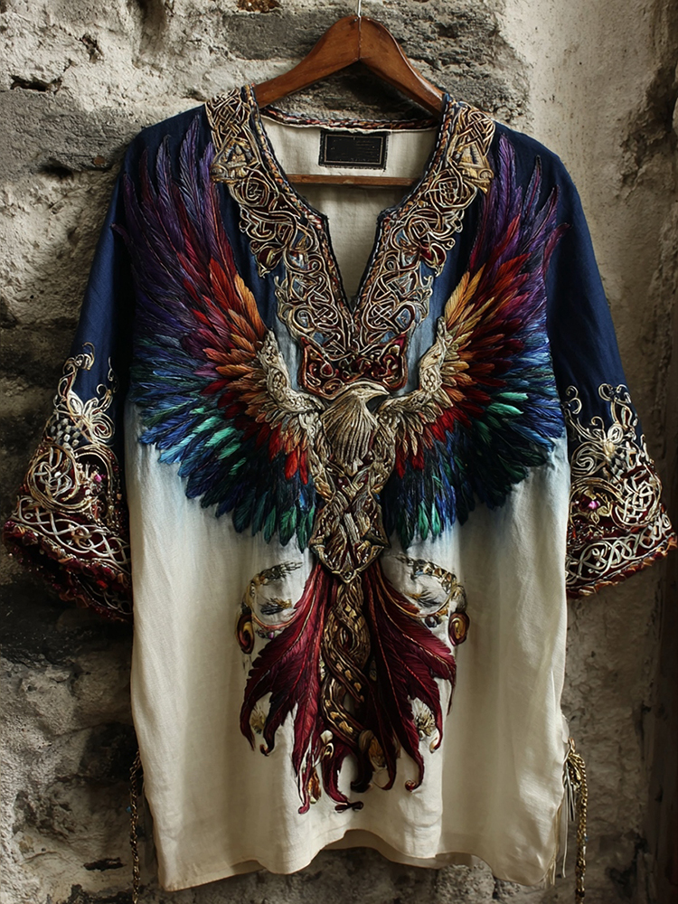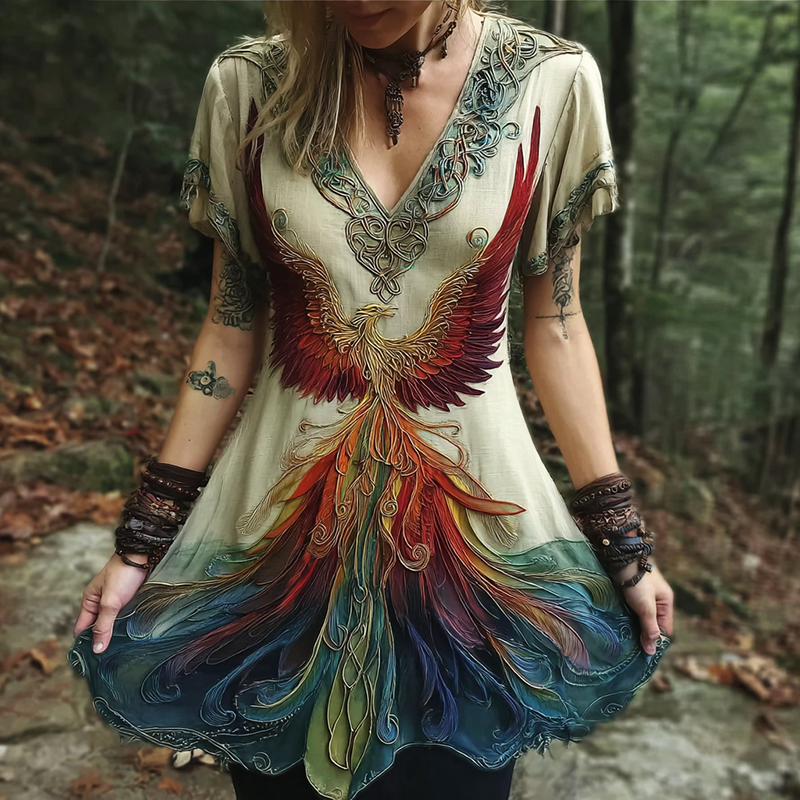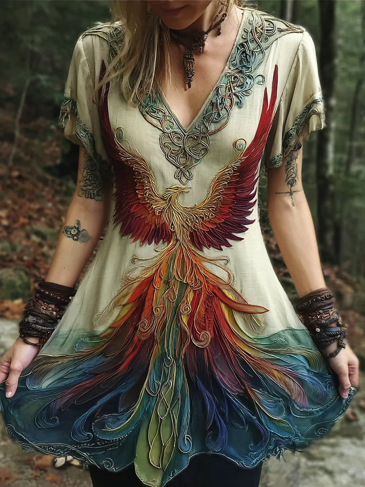 Women's Vintage Viking Celtic Knot Phoenix Embroidery Gradient V-neck T-shirt