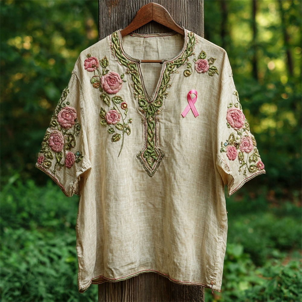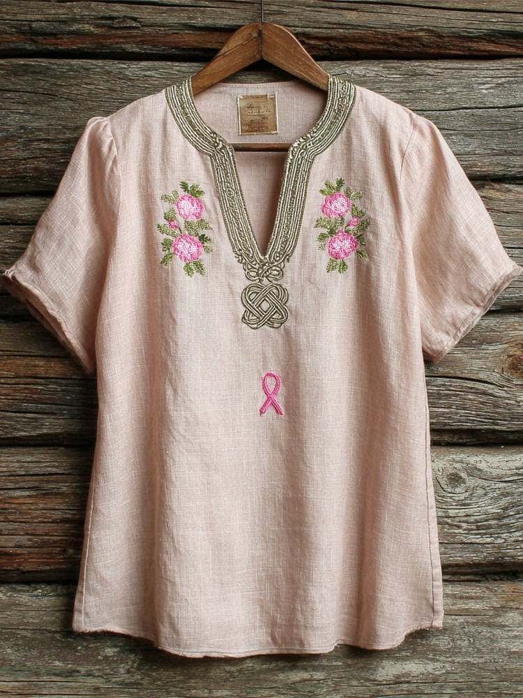 Floral Embroidery Pink Ribbon Awareness Women's Linen V-neck Shirt