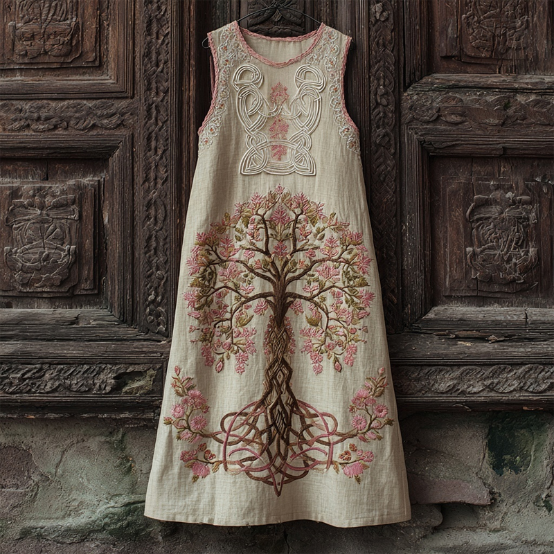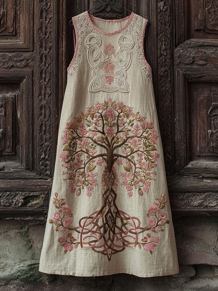 Pink Celtic Tree Of Life Embroidered Linen Midi Tank Dress