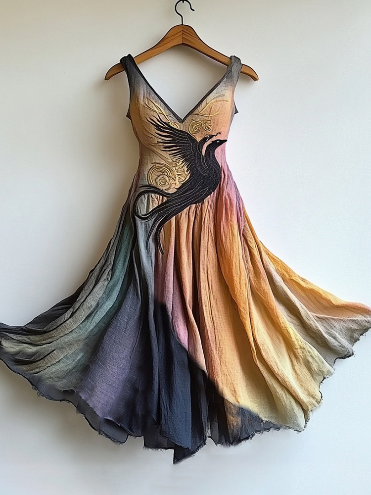 Women's Nordic Mythology Crow Gradient Linen Midi Dress