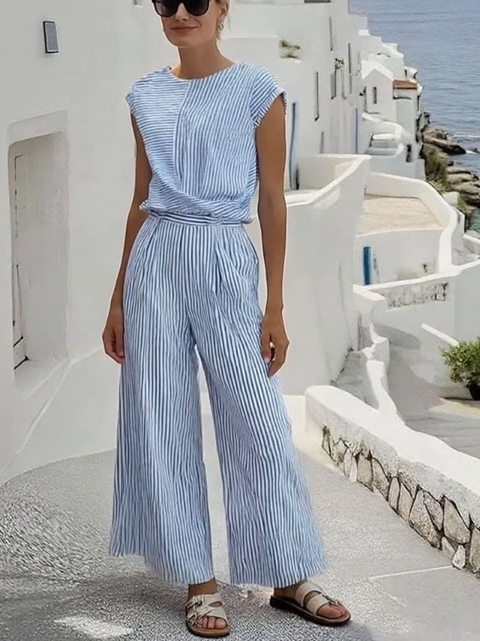Women's Casual Round Neck Striped Printed Trousers Two-Piece Set