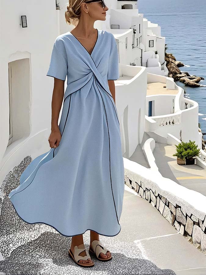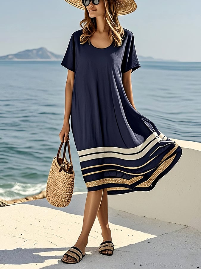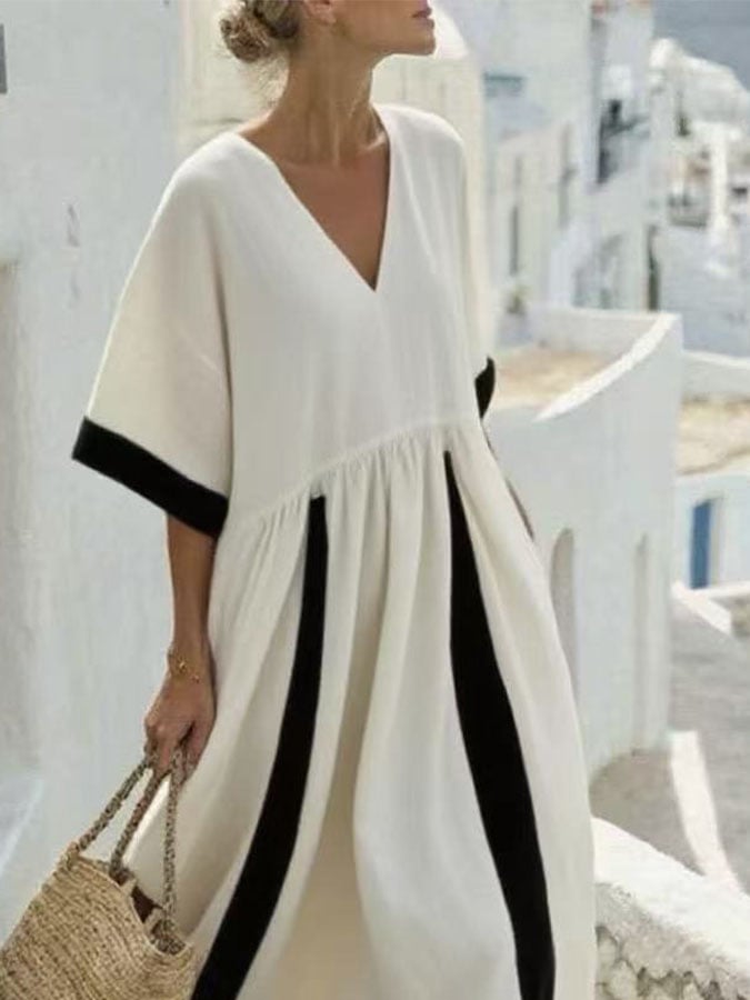 Women'S V-Neck Contrast Color Short-Sleeved Holiday Loose Dress