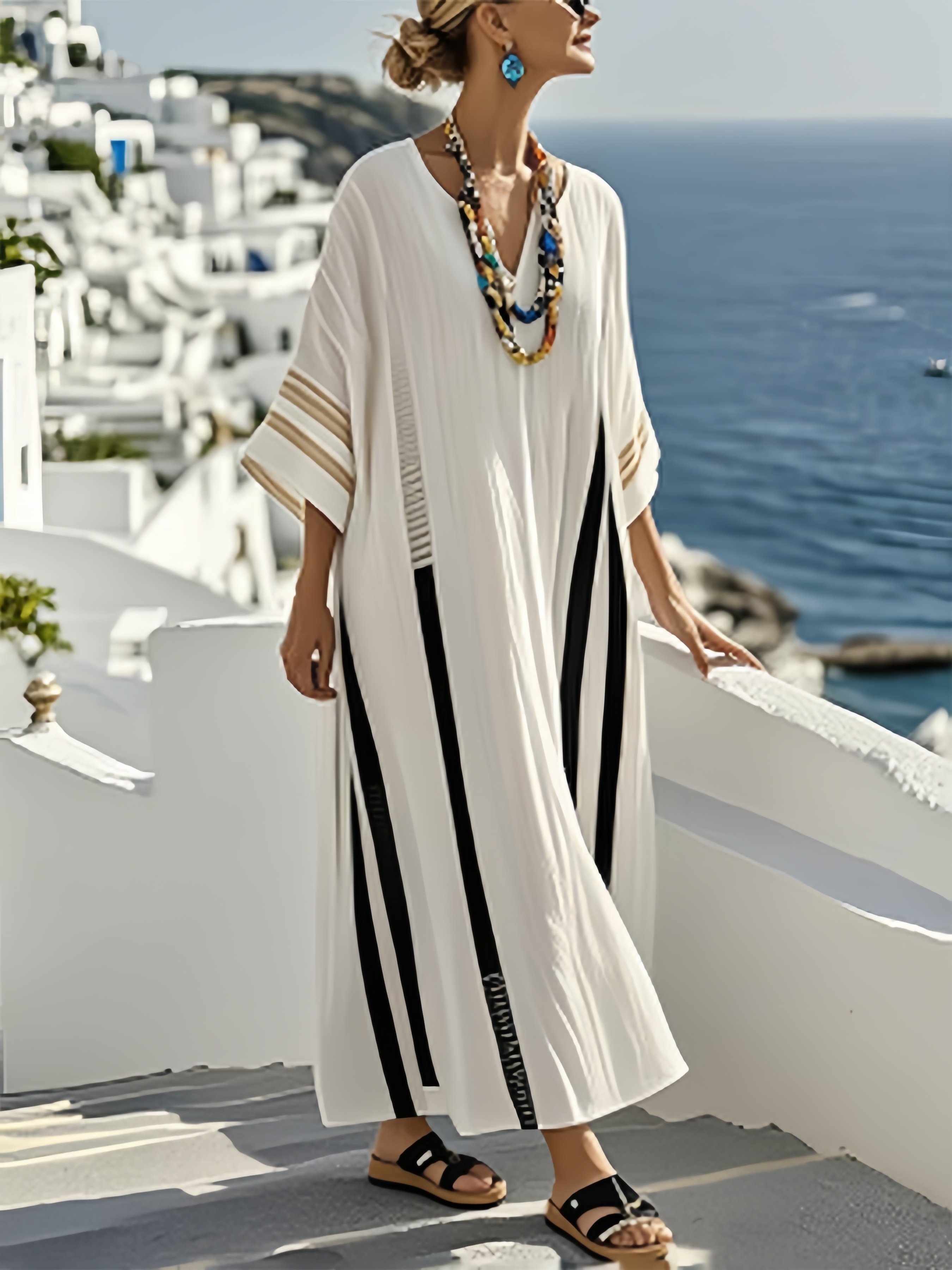 Women'S V-Neck Sleeveless Striped Holiday Loose Dress
