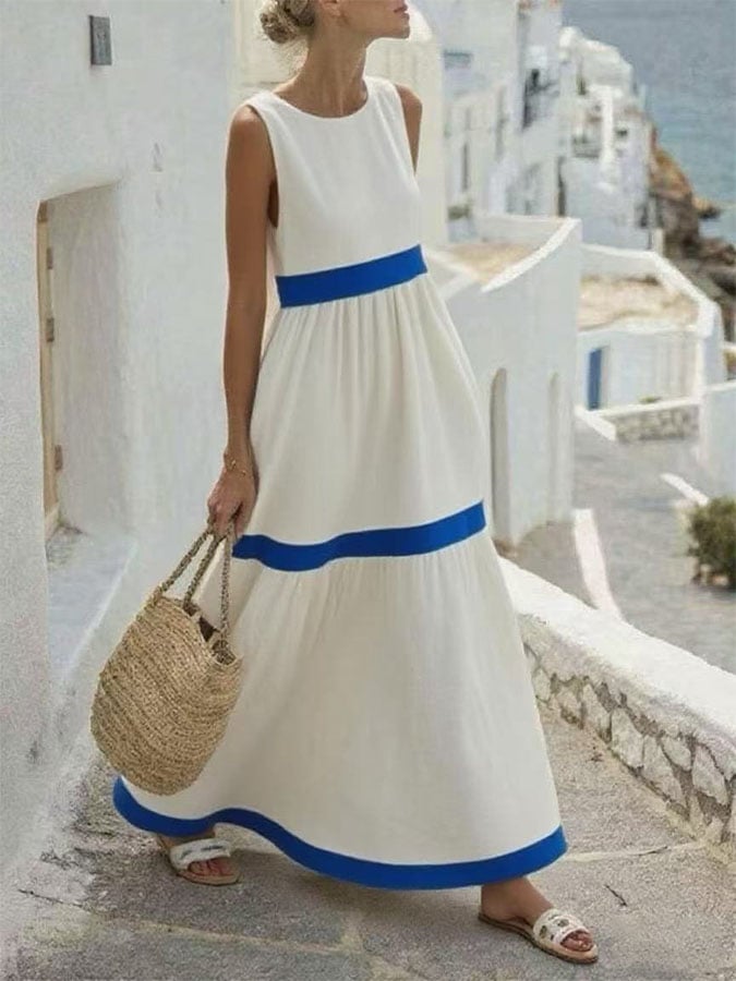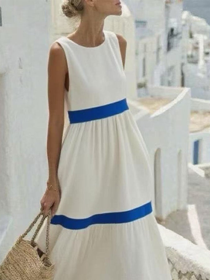 Women'S Round Neck Contrast Color Sleeveless Holiday Loose Dress