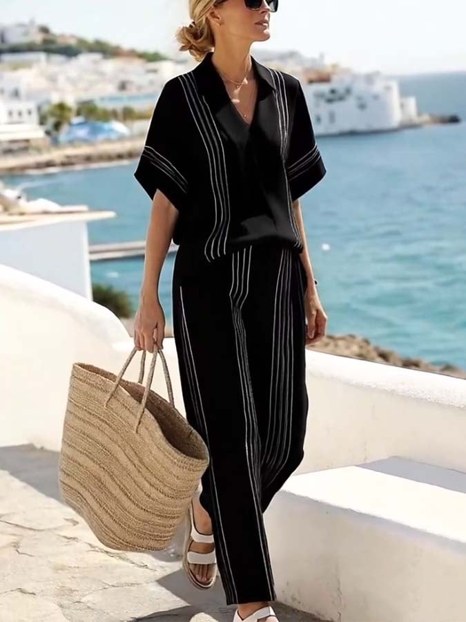 Women'S Casual V-Neck Short-Sleeved Striped Contrast Shorts Two-Piece Suit