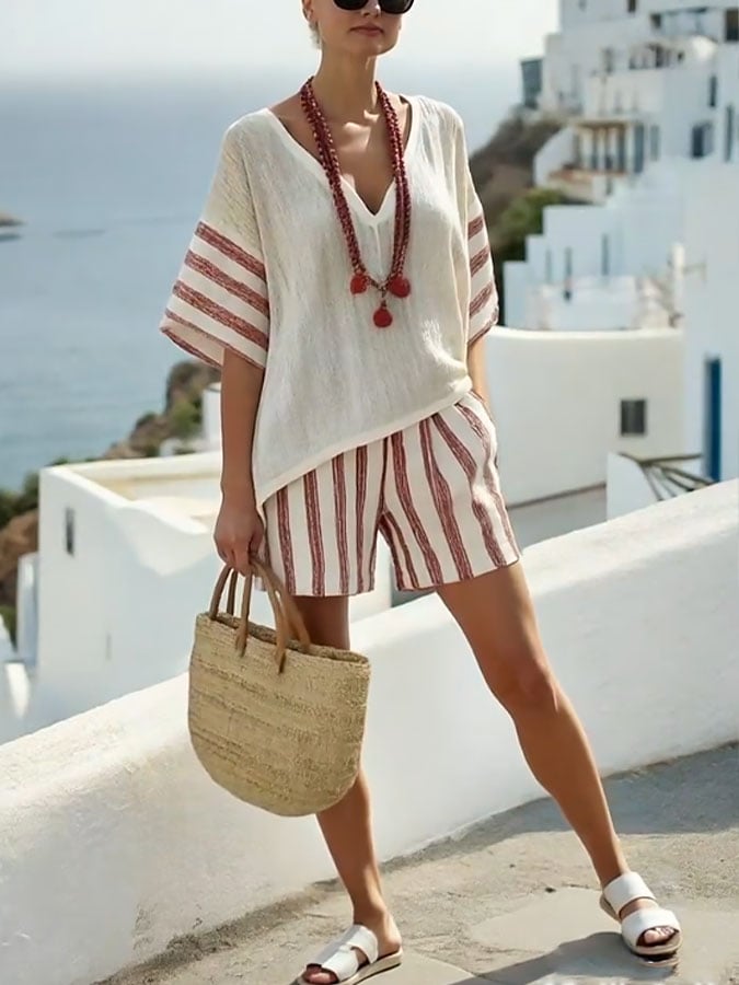 Women's Casual Vacation V-neck Striped Print Top and Shorts Two-piece Set