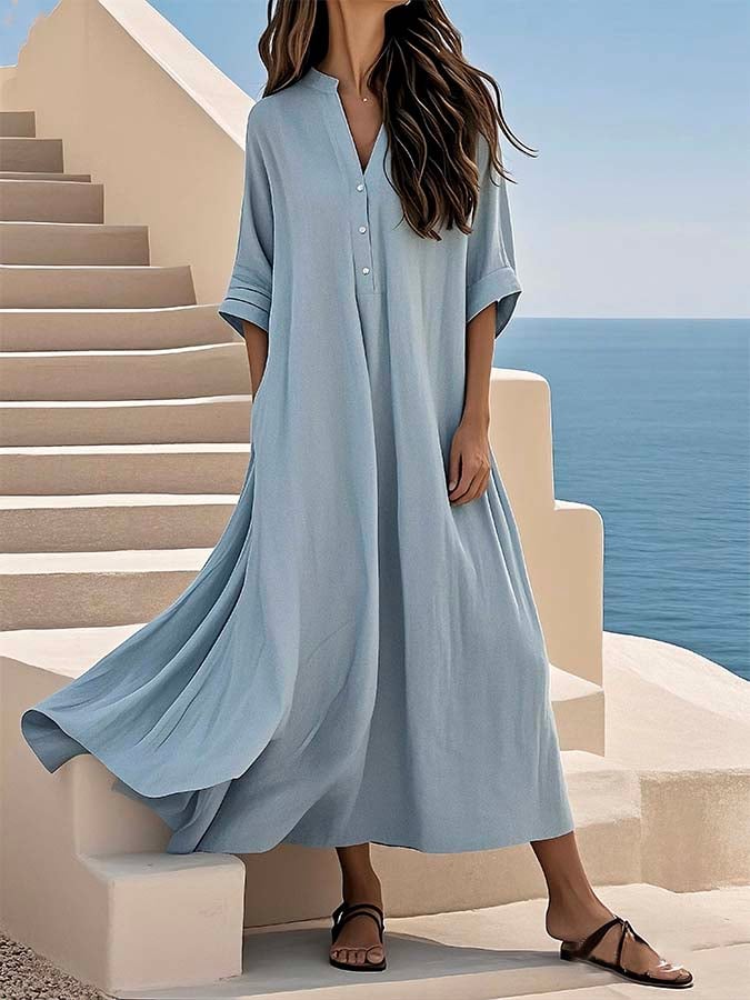 Women'S Solid Color Loose Cotton And Linen Pocket Dress