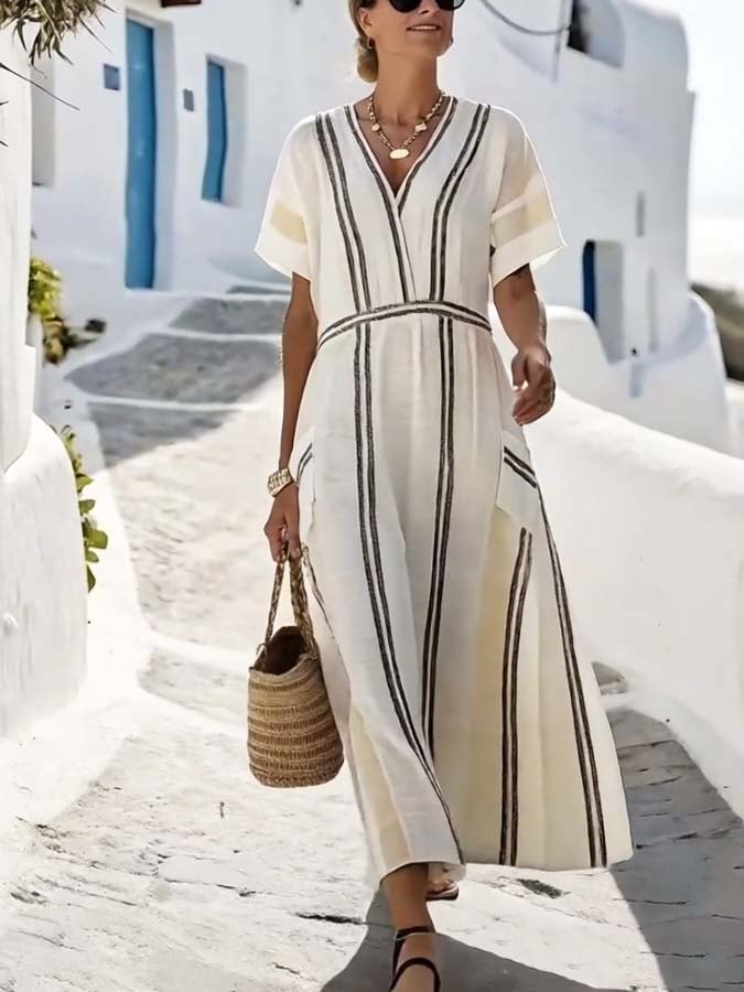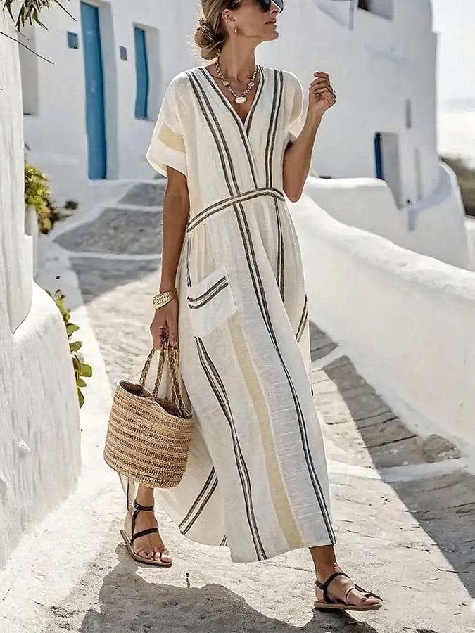 Women's Summer Cotton&Linen Striped Cross Collar Dress