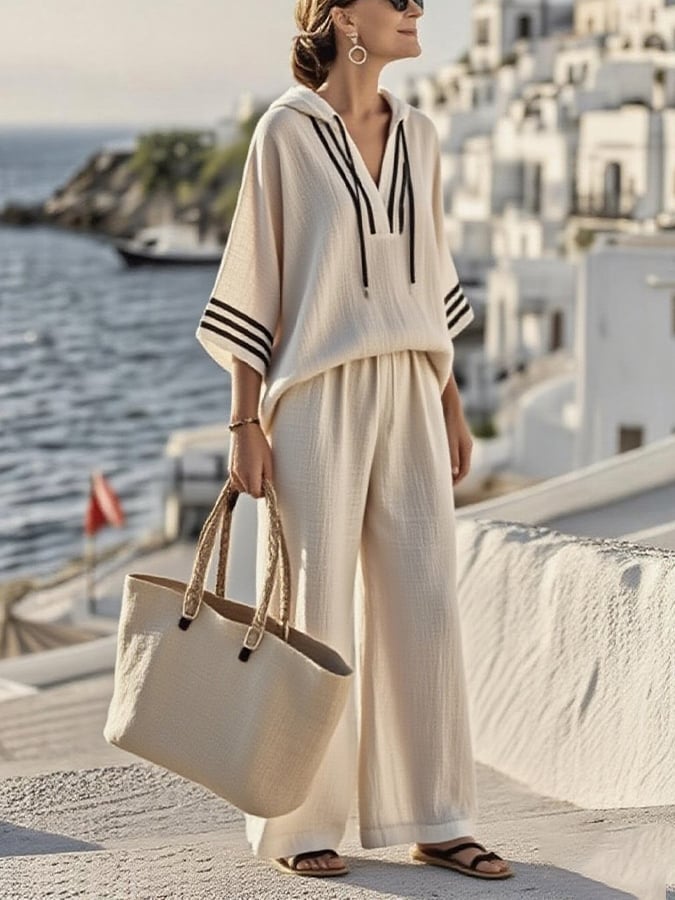 Women'S Casual Hooded Striped Cotton And Linen Two-Piece Set