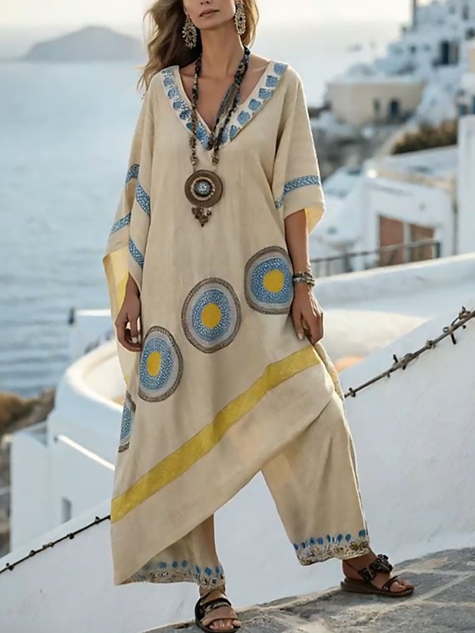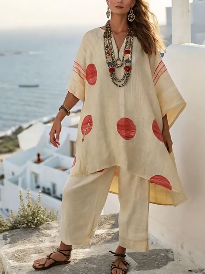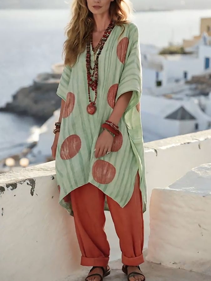 Women's Casual V-Neck Printed Top and Pants Two-Piece Set