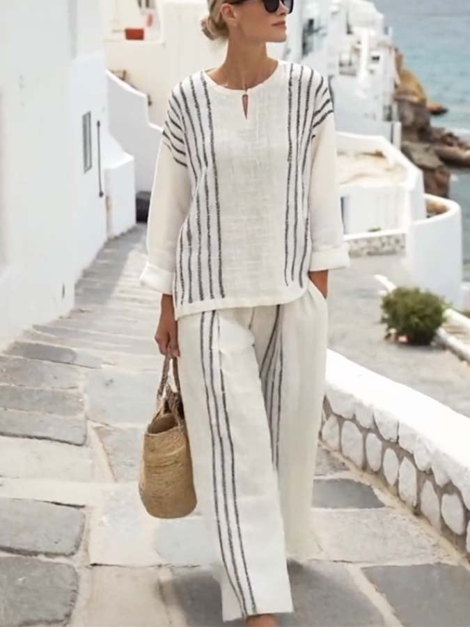 Women's Summer Cotton&Linen Lace-Up Striped Cuff Suit