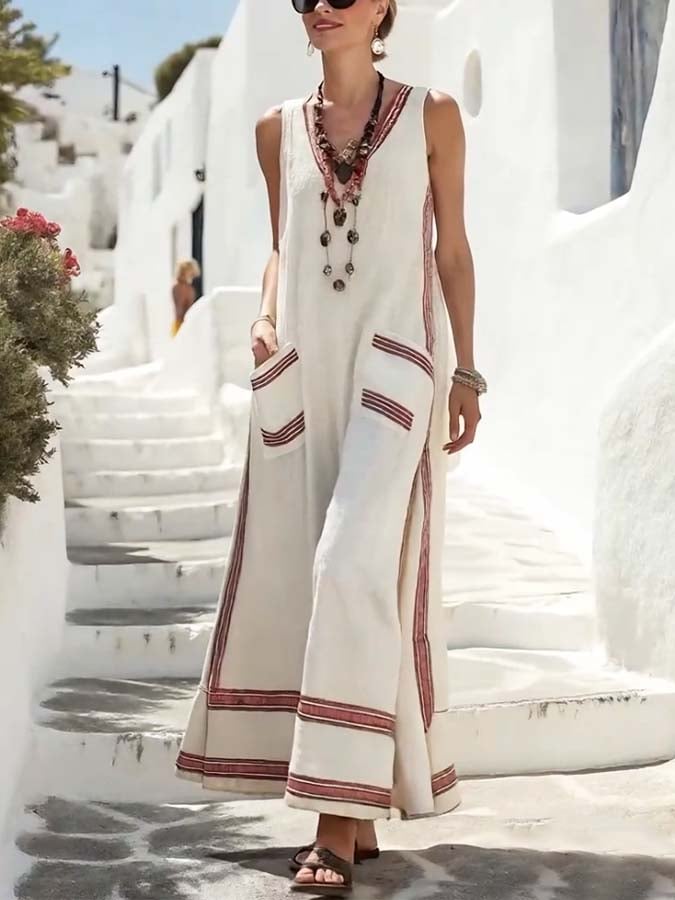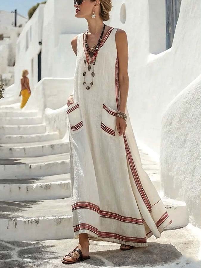 Women's Summer Cotton&Linen Small V-Neck Dress