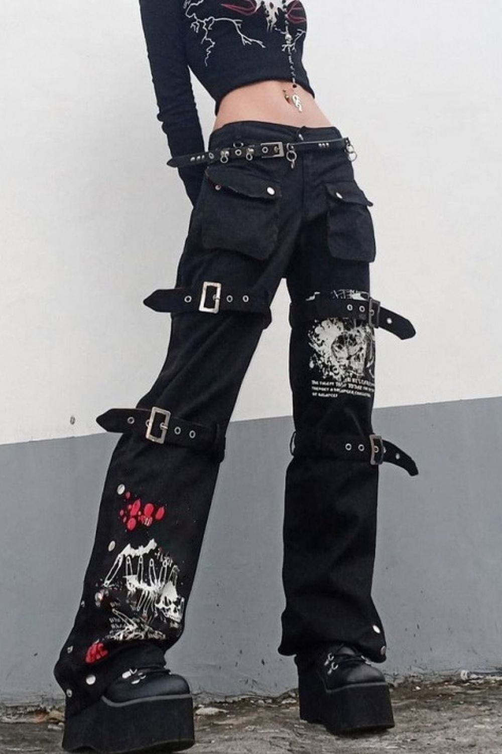 Women's Gothic Punk Print Low Rise Wide Leg Cargo Pants