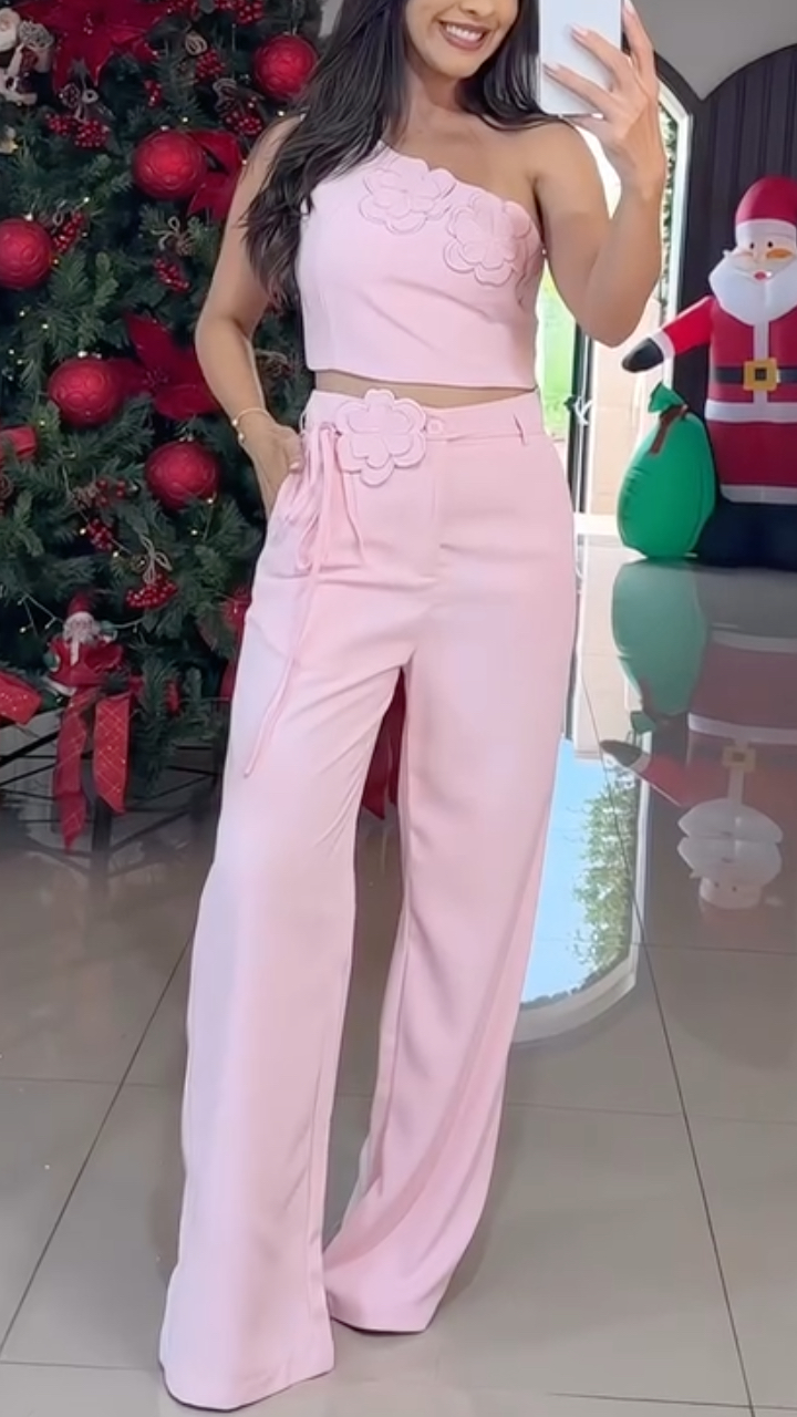 Women's 3D Floral One-Shoulder Cropped Tube Top + Wide-Leg Suit