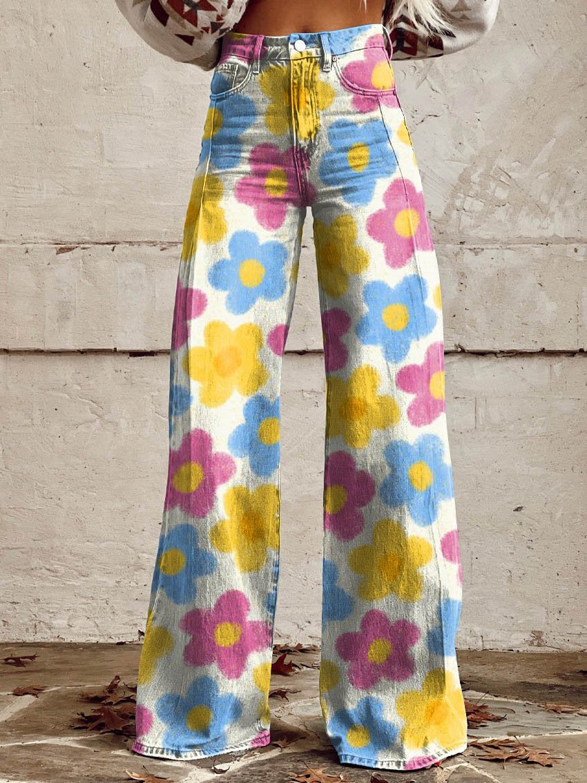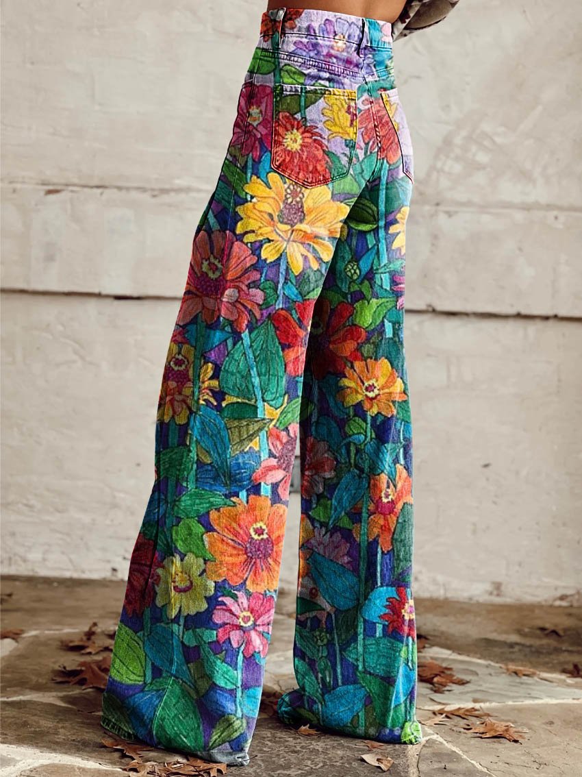 Women's Colorful Flower Print Casual Wide Leg Pants