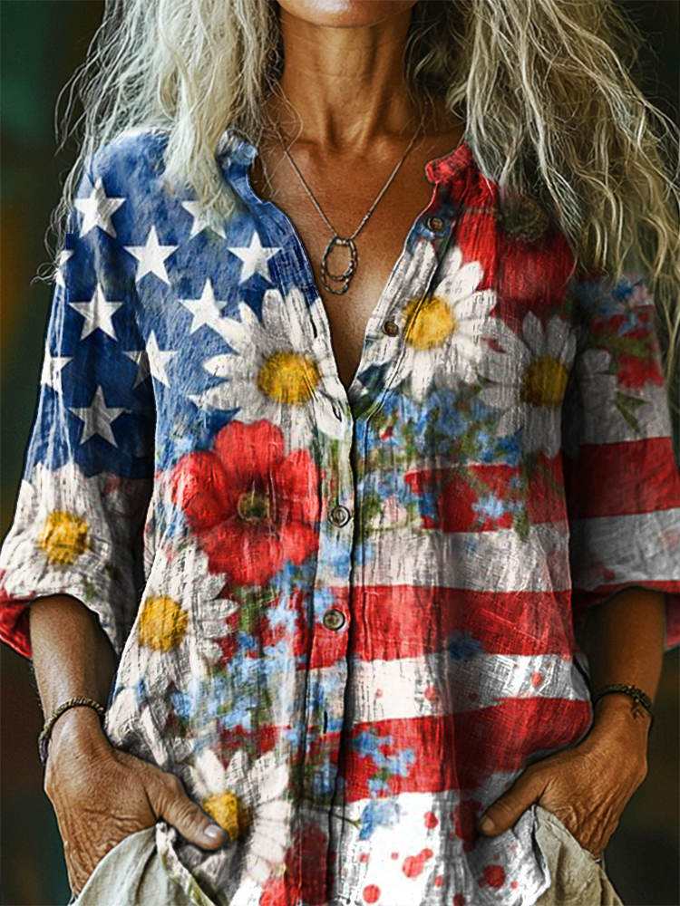Women's Vintage American Flag Floral Art Print Casual Cotton Linen Shirt