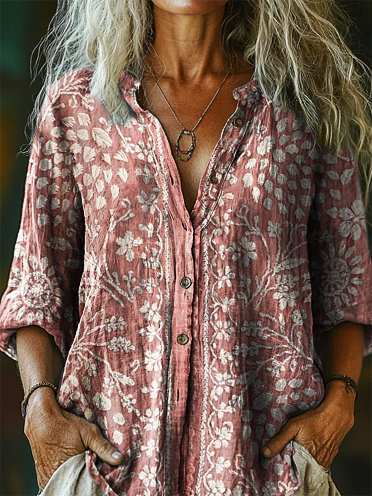 Women's Vintage Floral Art Pattern Print Casual Cotton Linen Shirt