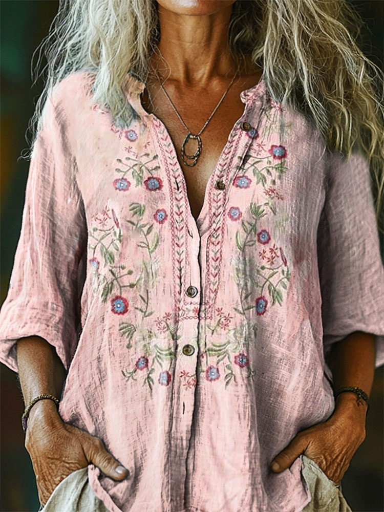 Women's Folk Floral Print Casual Cotton Linen Shirt