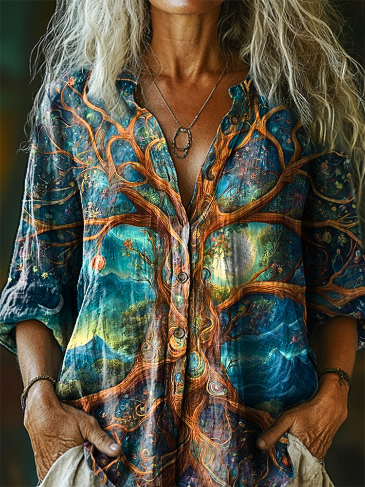 Women's Vintage Bohemian Totem Art Print Casual Cotton Linen Shirt