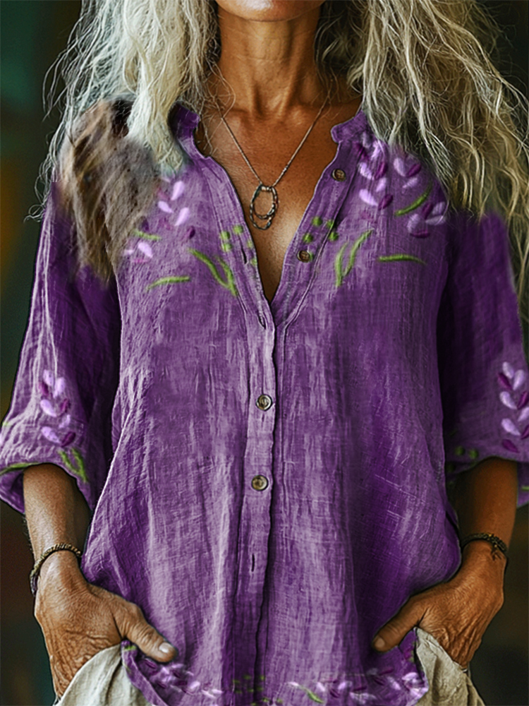 Women's Floral Textured Art Patterns Print Linen And Cotton V-neck Casual Shirt