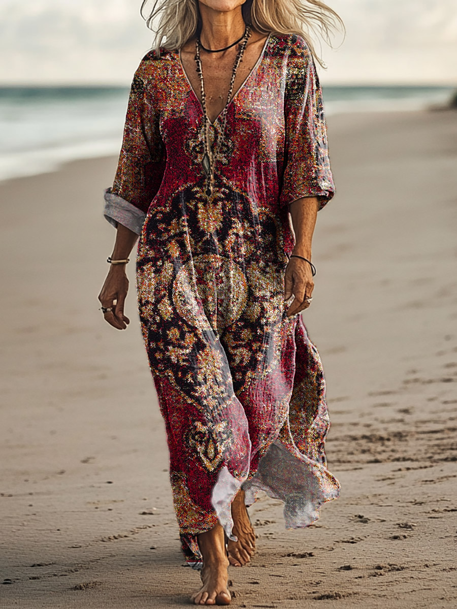 Women's Vintage Paisley Flower Art Print Pocket Cotton Dress