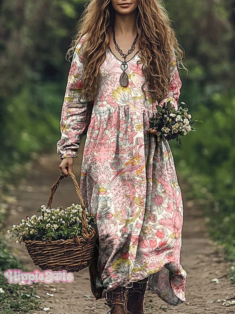 Women's Vintage Folk Flower Art Print Pocket Cotton Dress