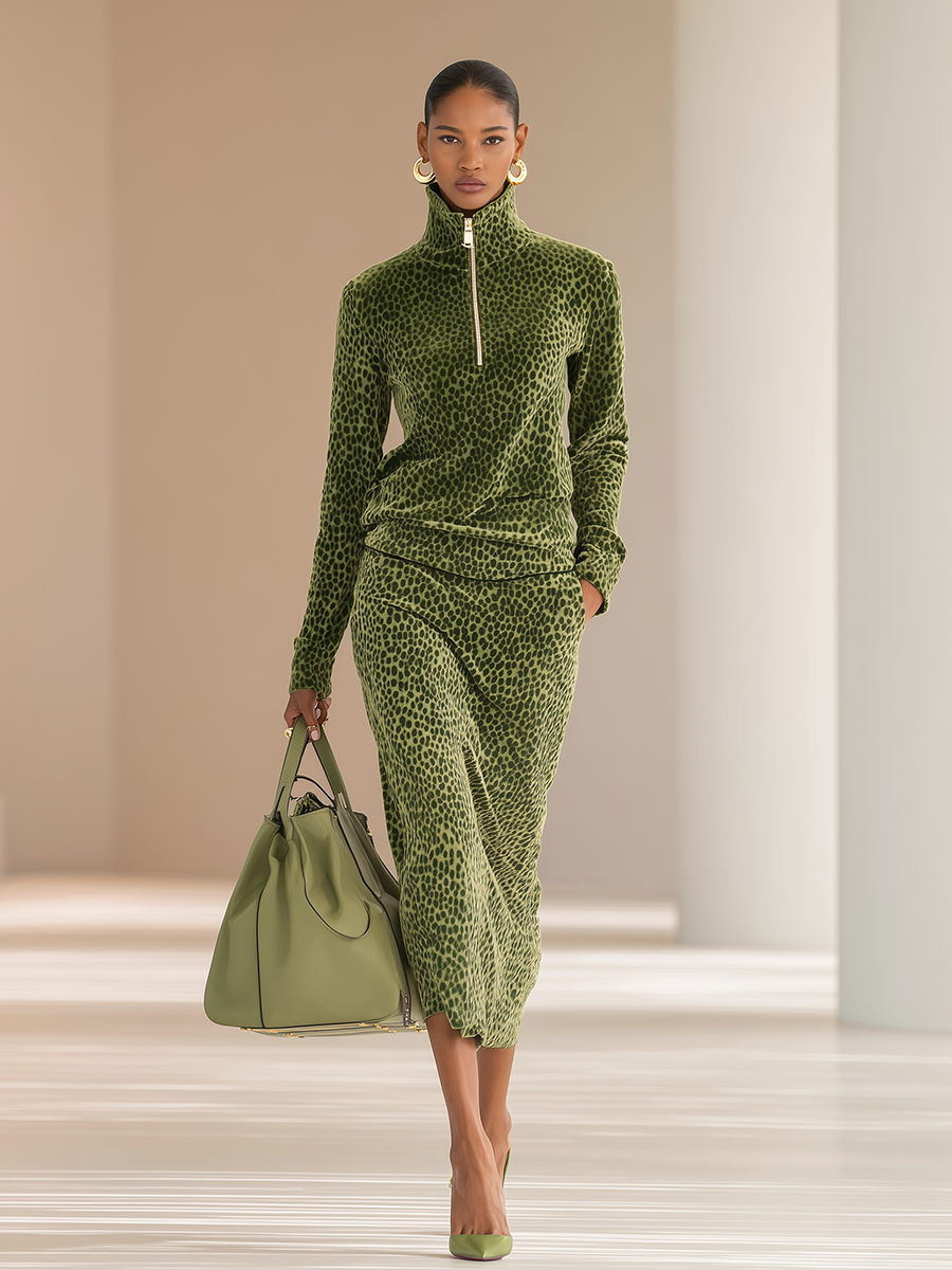 Sports Retro Leopard Print Stand Collar Velvet Top + Skirt Set