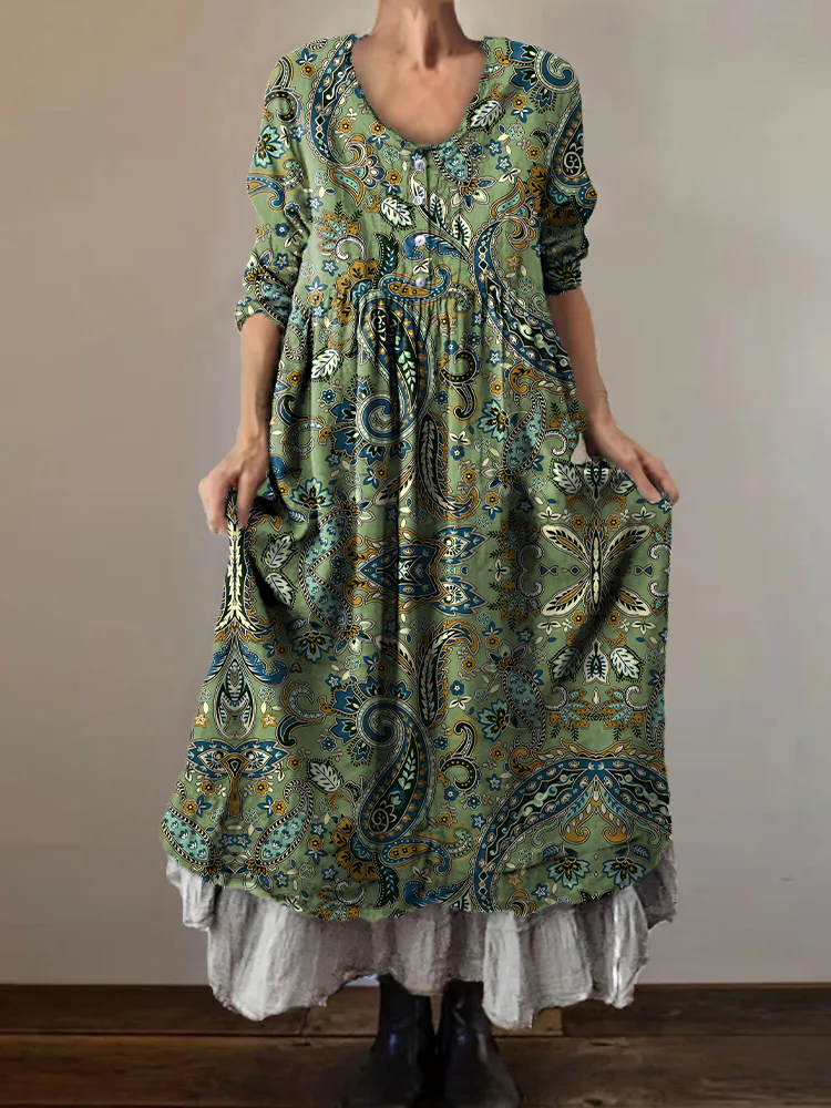 Women's Vintage Paisley Floral Art Print V-Neck Button Pocket Cotton Dress