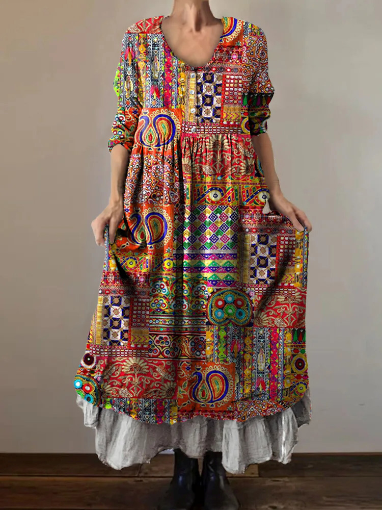Women's Bohemian Patchwork Art Print V-Neck Button Pocket Cotton Dress