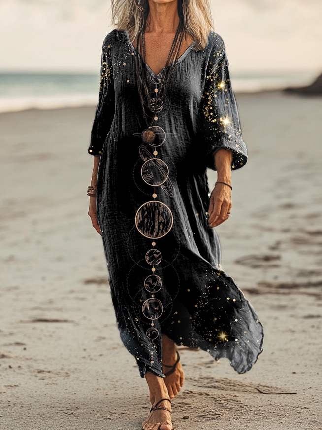 Women's Planet Pattern Art Print Pocket Cotton Dress