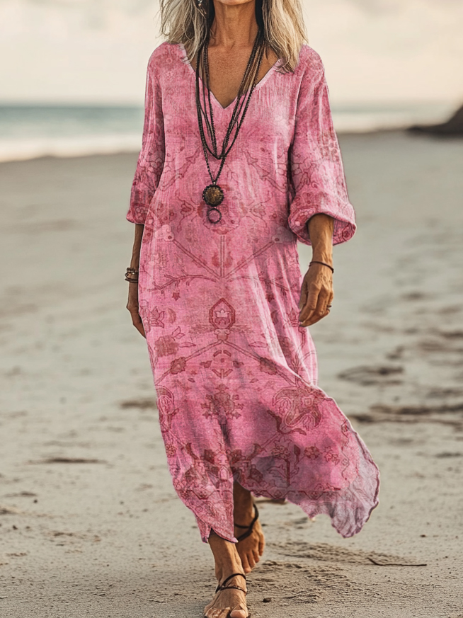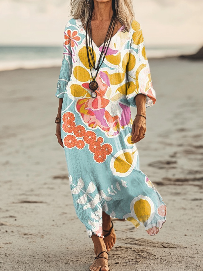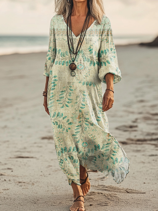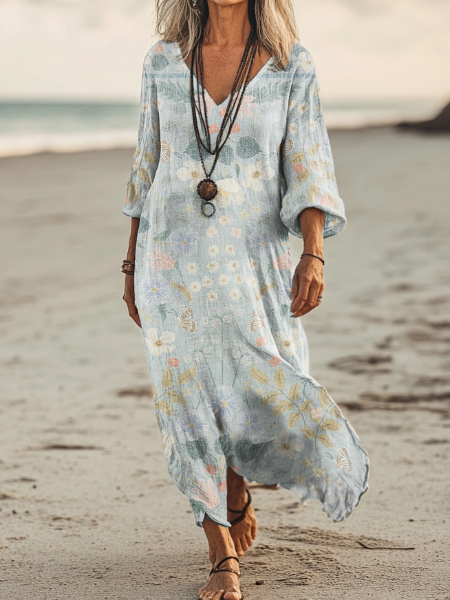 Women's Art Floral Hippie Vintage Print V Neck Dress