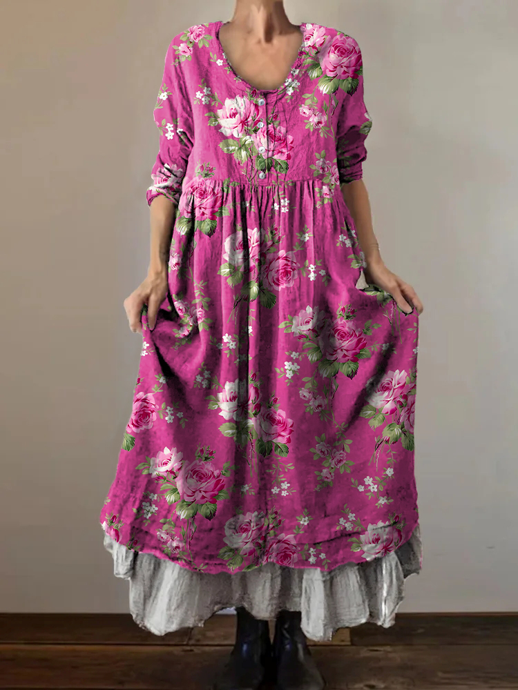 Women's Vintage Rose Floral Art Print V-Neck Button Pocket Cotton Dress