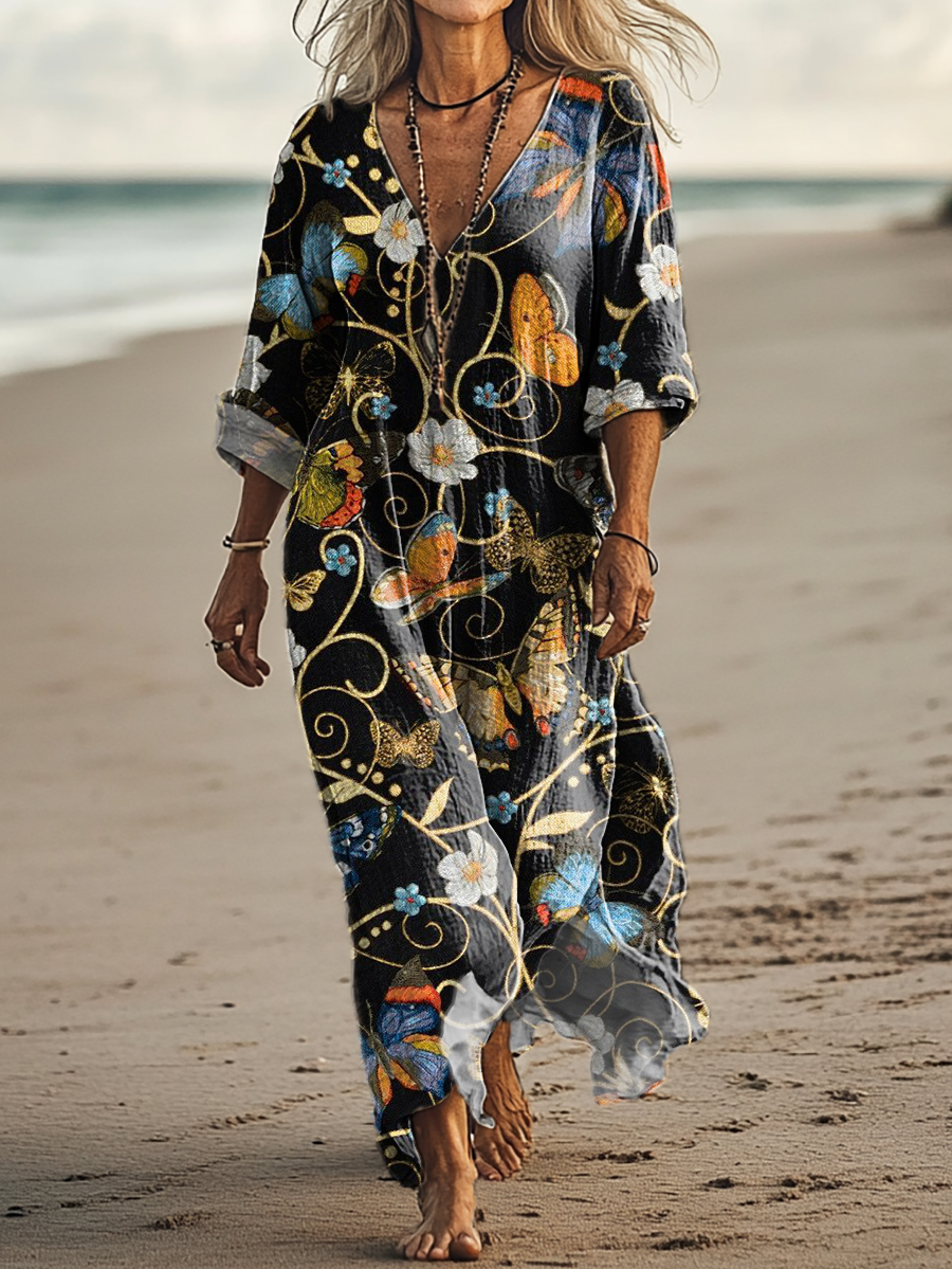 Women's Vintage Butterfly Art Print Pocket Cotton Dress
