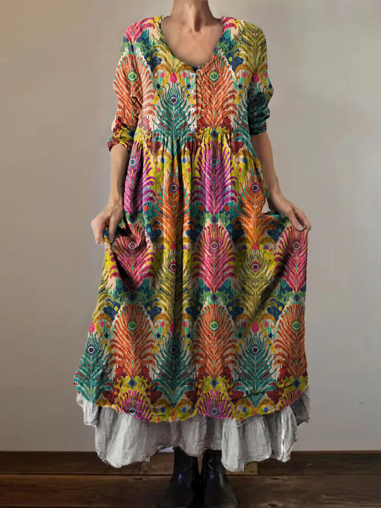 Women's Ethnic Art Print V-Neck Button Pocket Cotton Dress