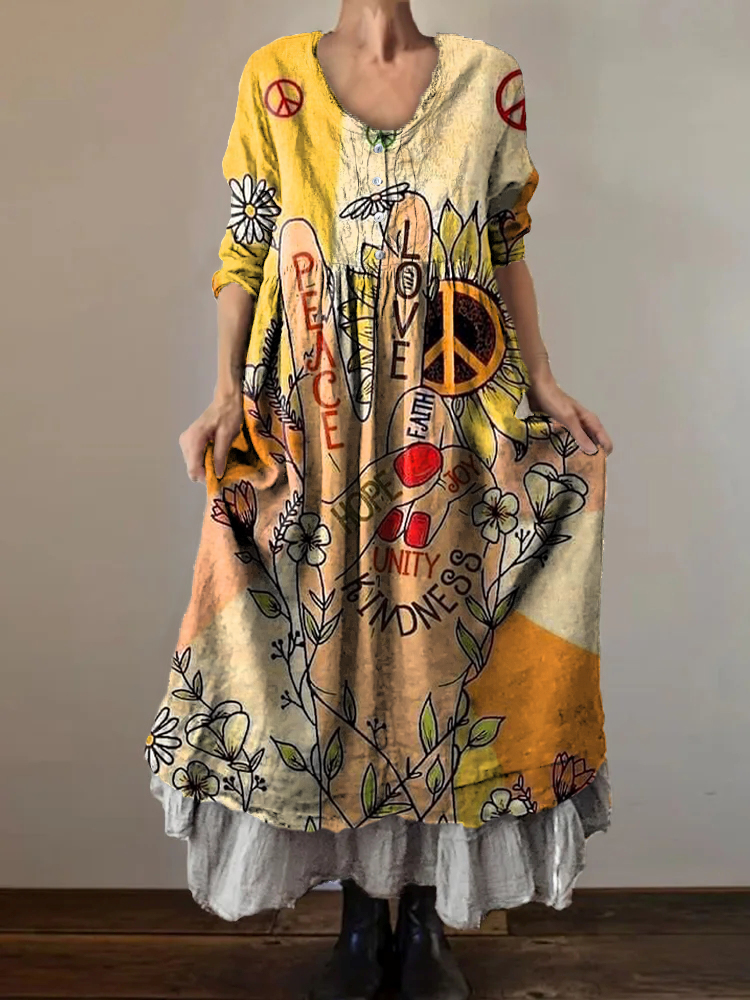 Women's Hippie Peace Love Art Print V-Neck Button Pocket Cotton Dress