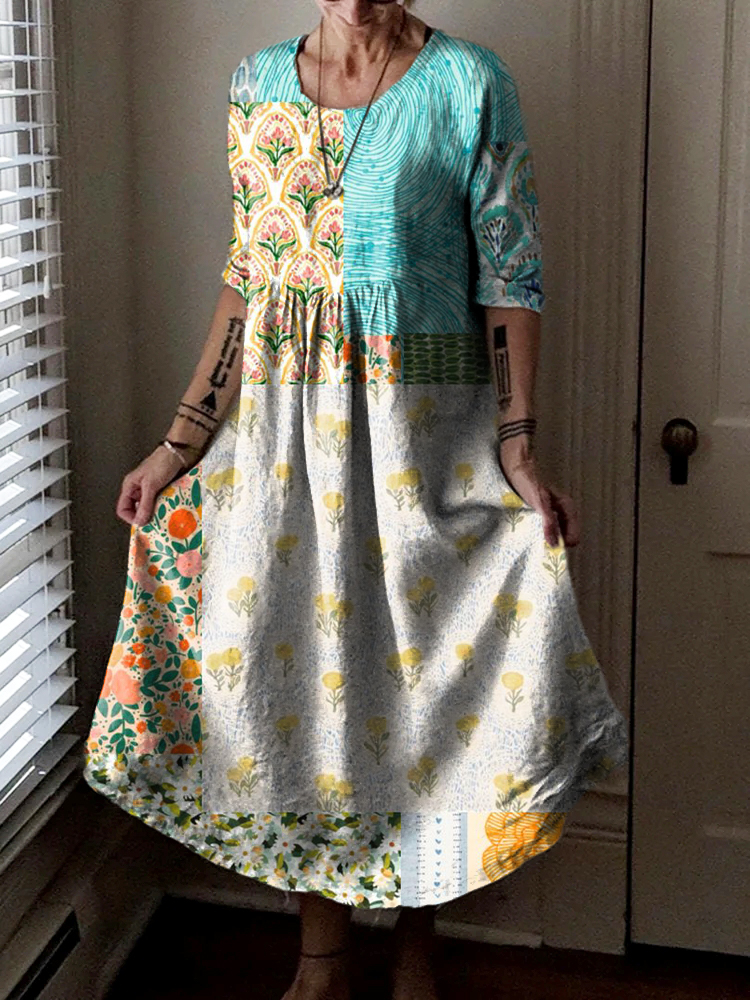 Women's Vintage Floral Patchwork Art Print Pocket Cotton Dress