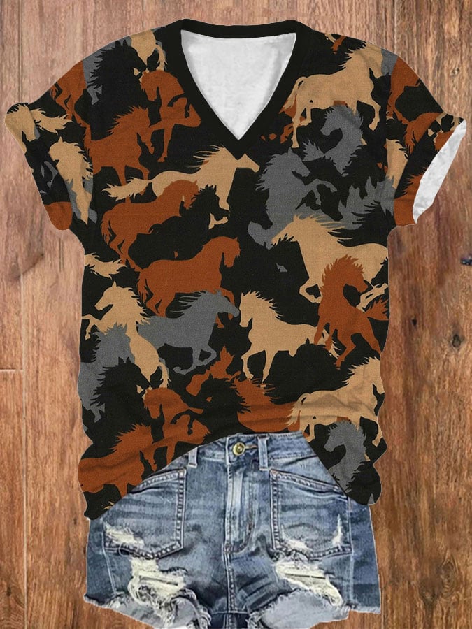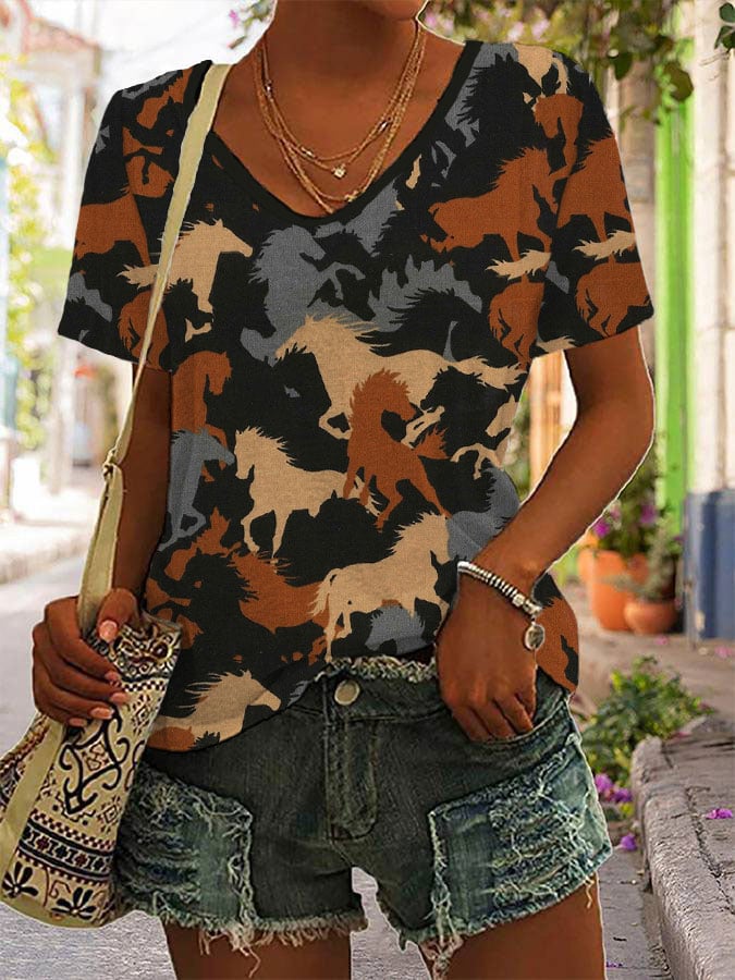 Women's Vintage Silhouette Horse Print V-Neck T-Shirt