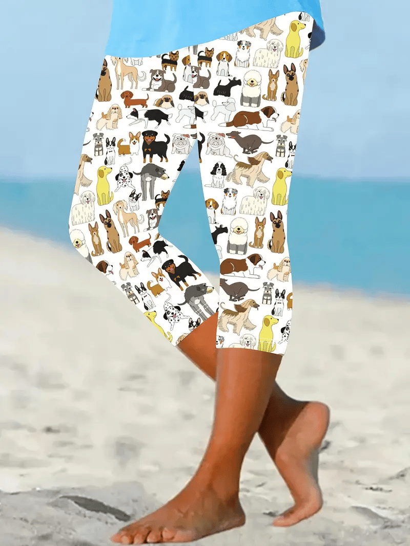 Dog Walking Print Round Neck Short Sleeved T-Shirt