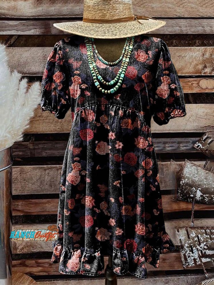 Women's Vintage Rose Print Casual Pocket Cotton Dress