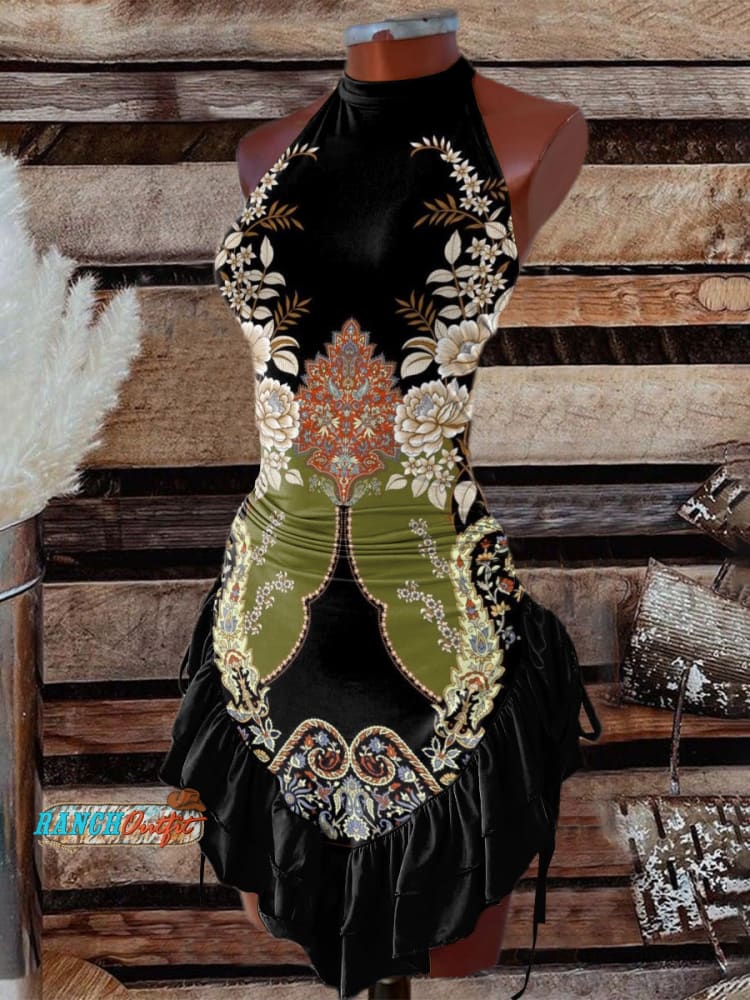 Women's Black Floral Pattern Print Halter Neck Dress