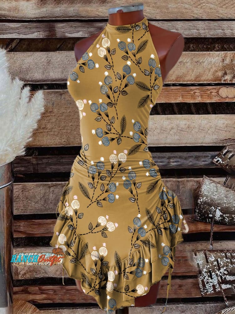 Women's Yellow Floral Pattern Print Halter Neck Dress