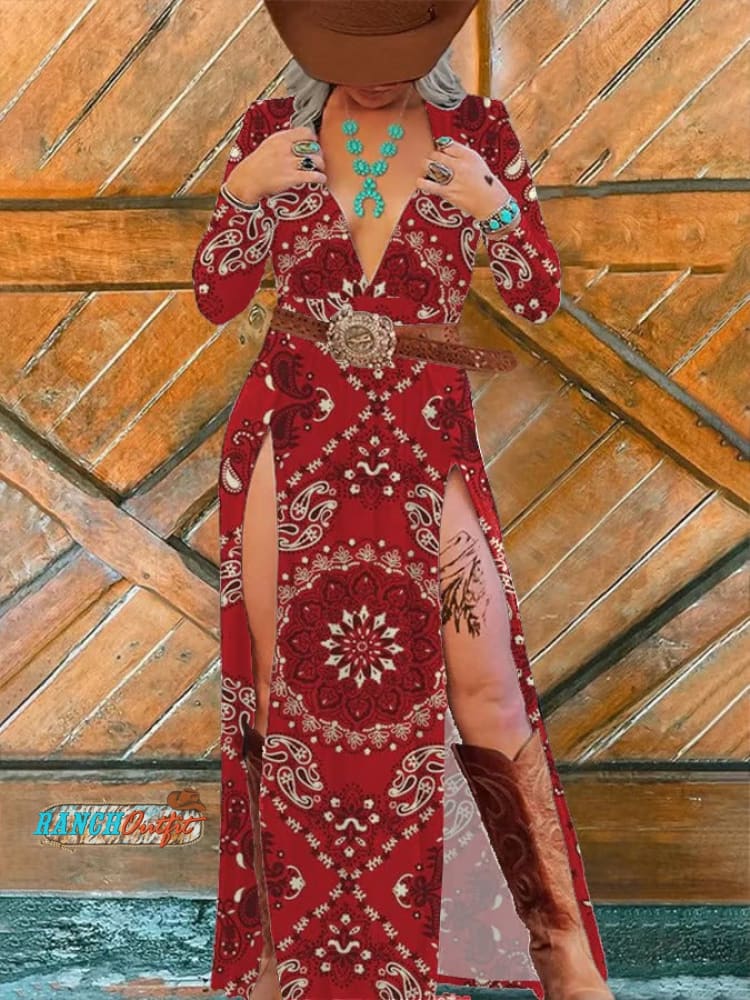 Women's Vintage Art Print Slit Deep V Neck Dress