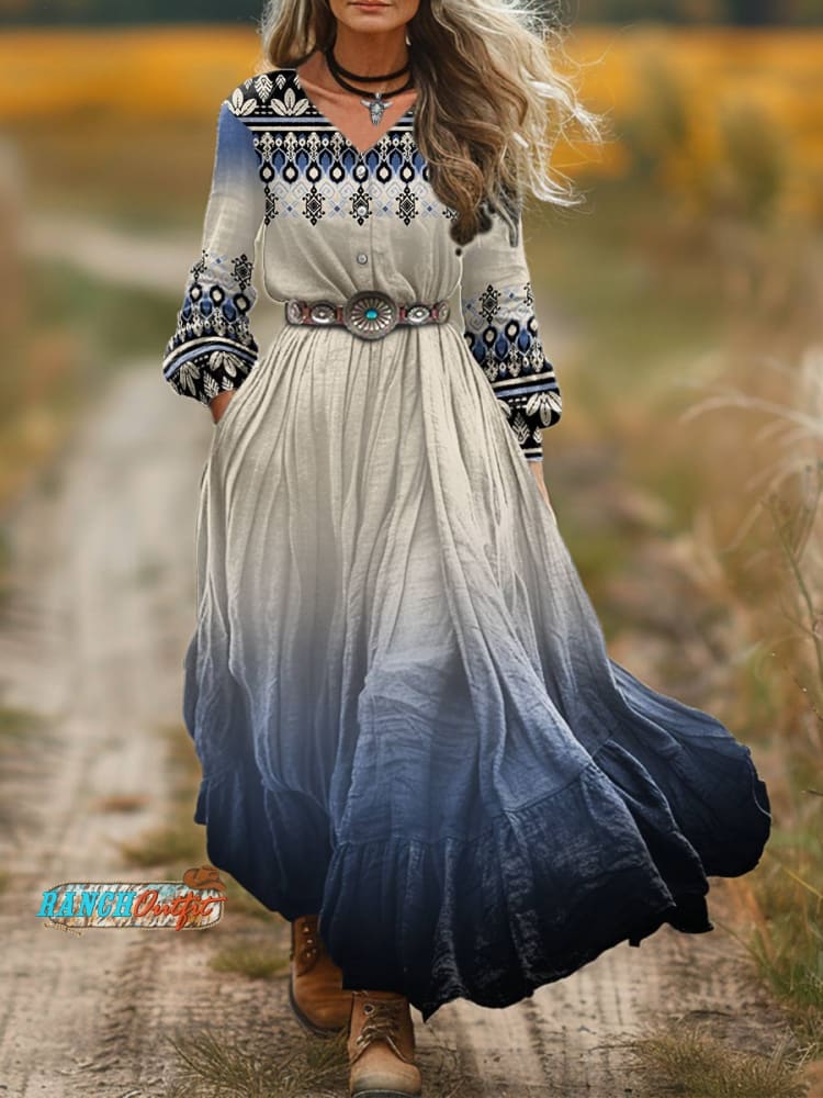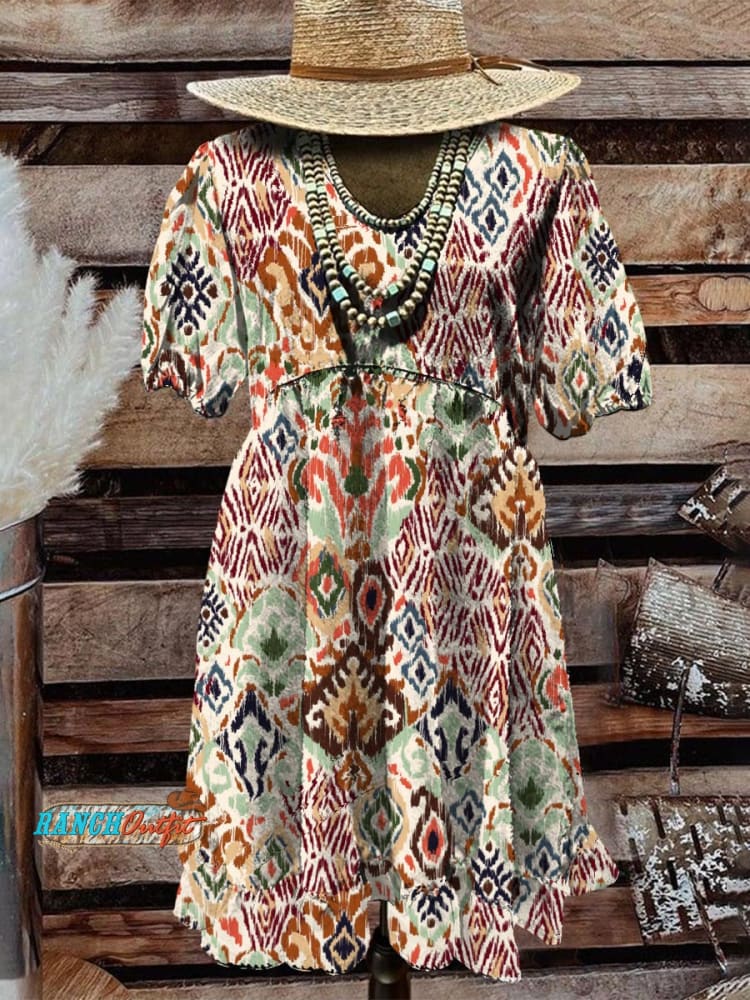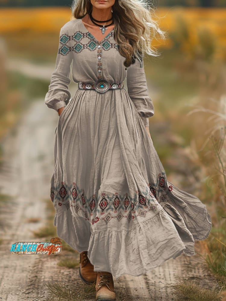 Women's Geometric Ethnic Print V-Neck Button Pocket Cotton Dress
