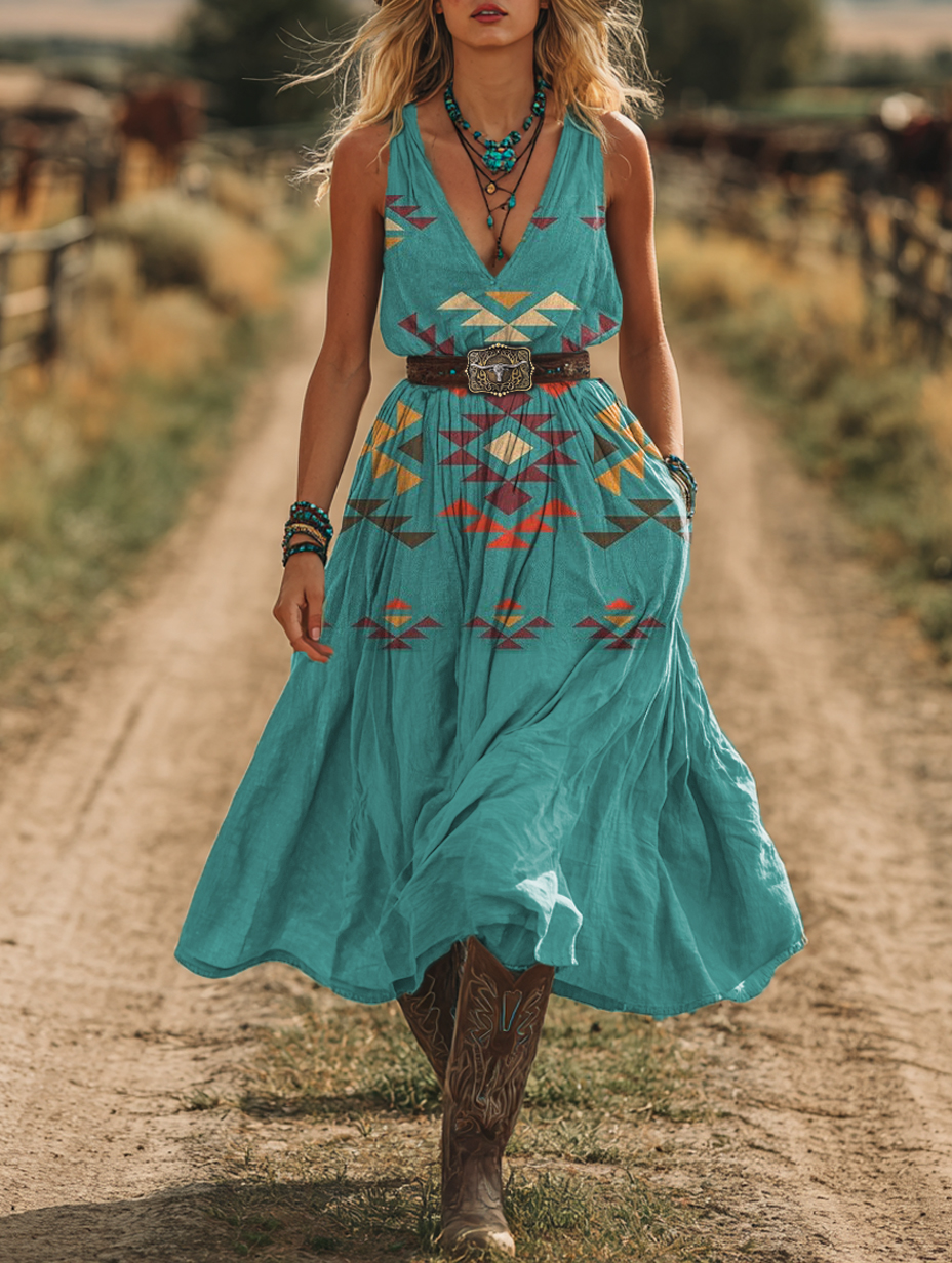 Women's Vintage Aztec Print Sleeveless Cotton and Linen Pocket Dress