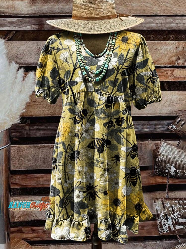 Women's Vintage Bee Floral Print Casual Pocket Cotton Dress