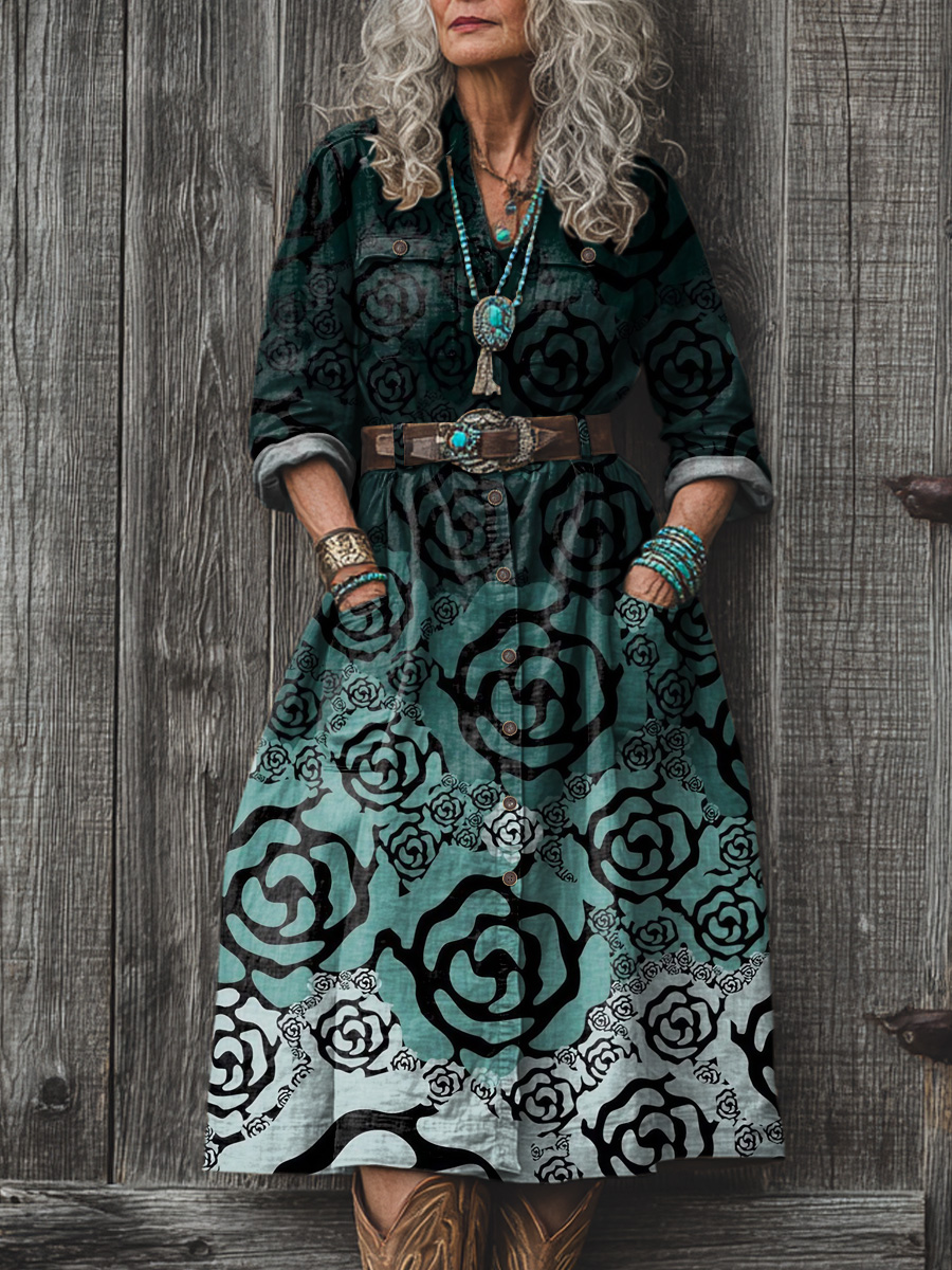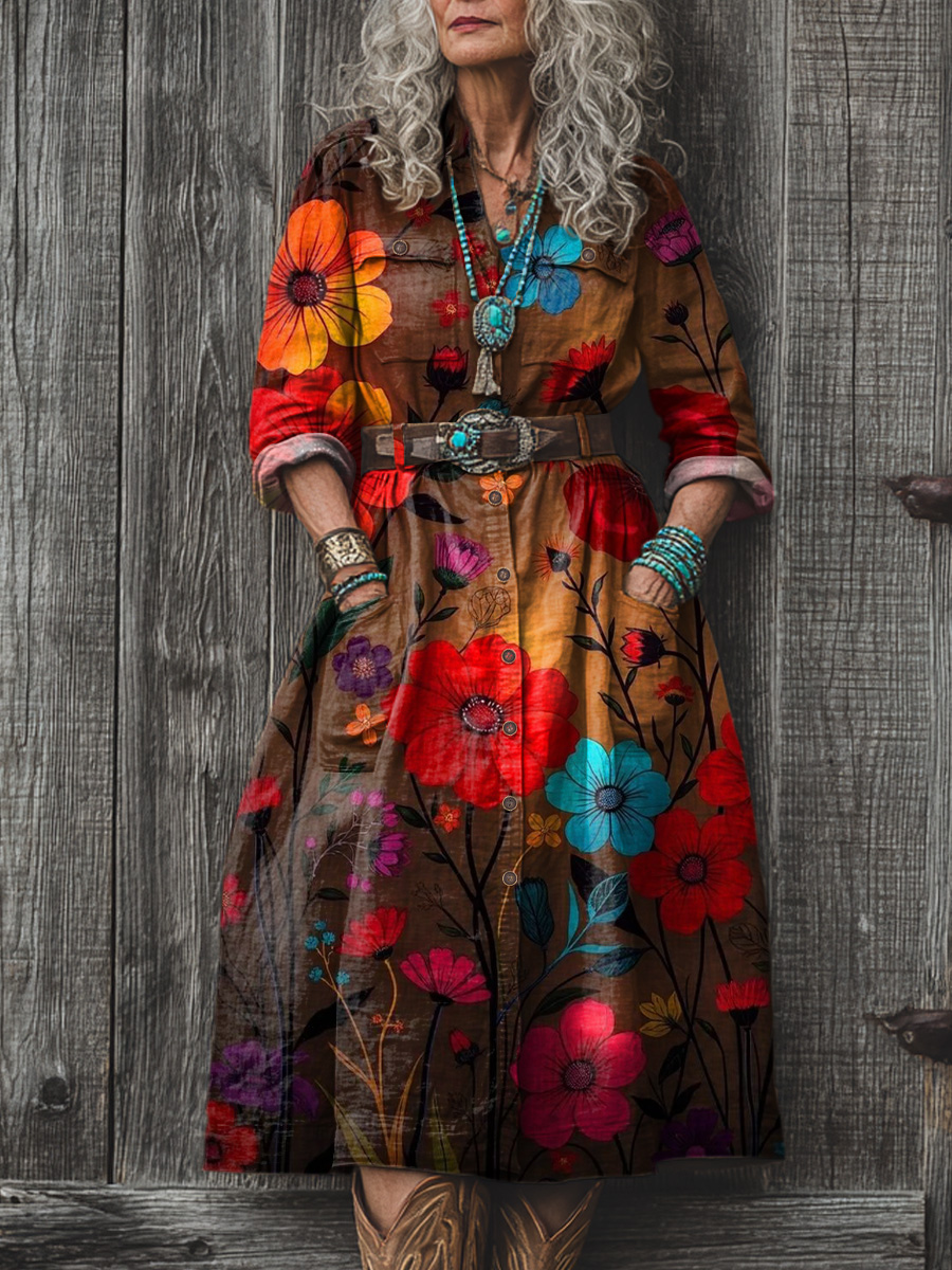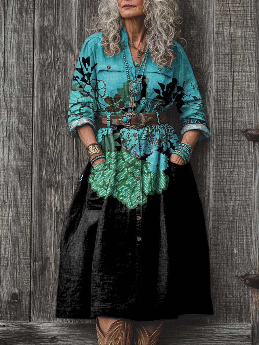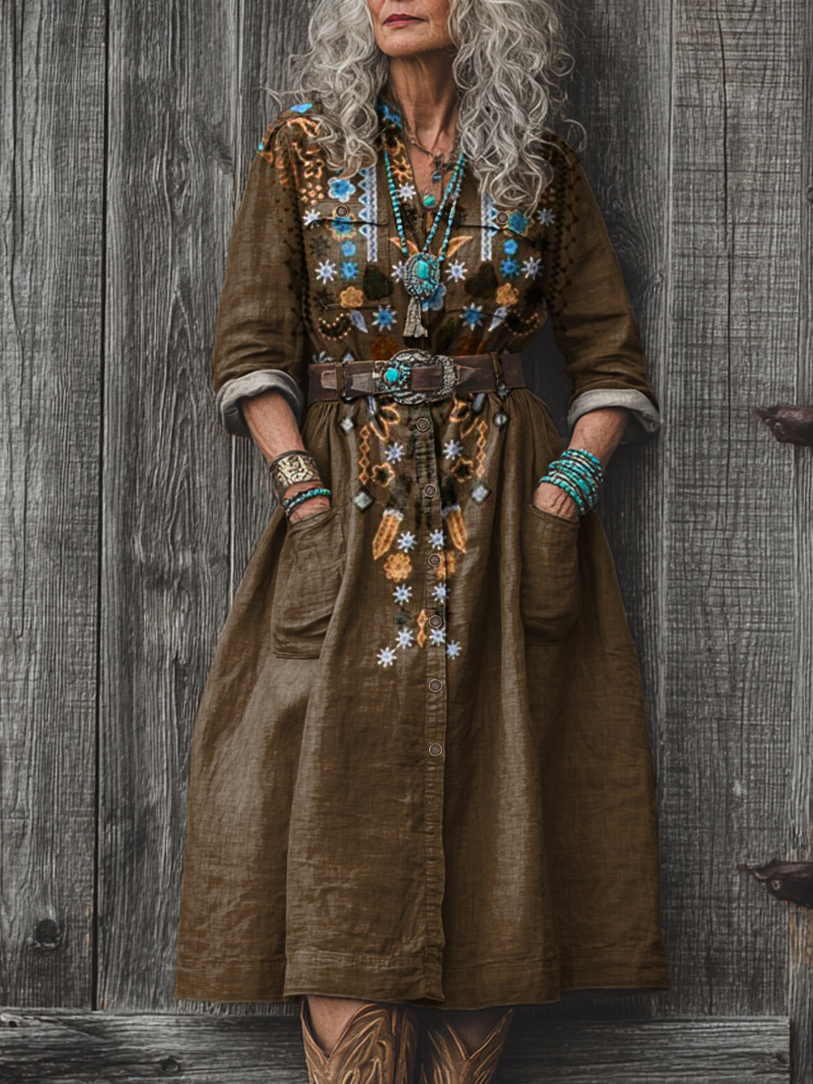 Women's Ethnic Imitation Embroidery Vintage Flowers Art Print Dress