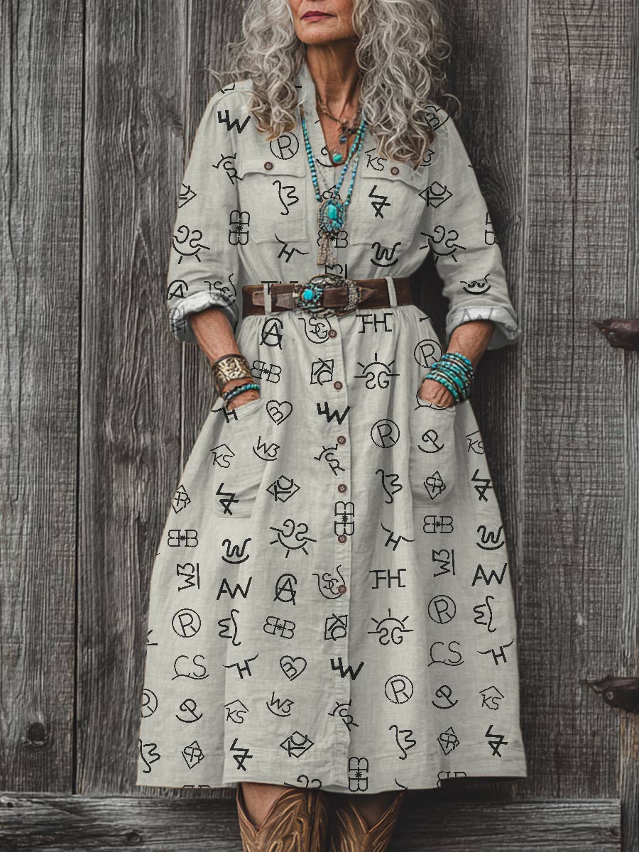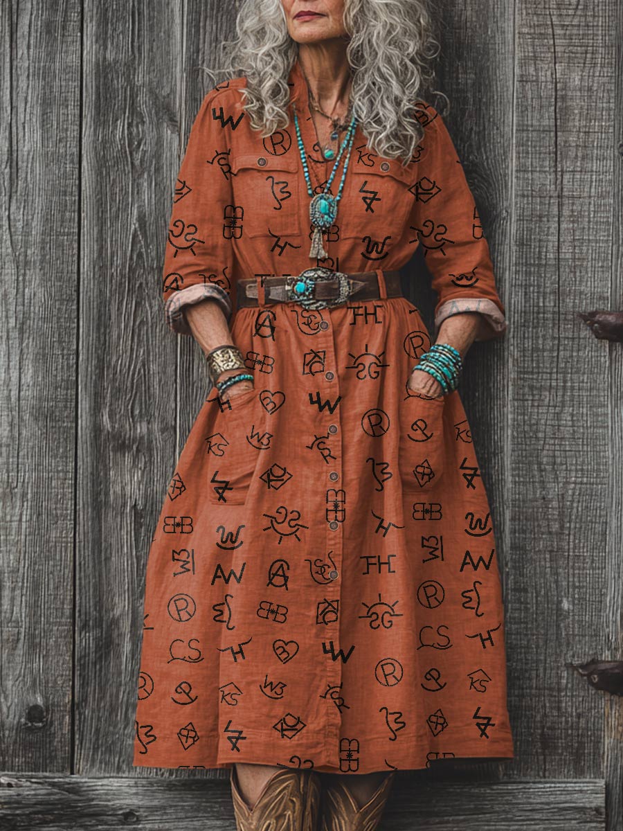 Vintage V-neck Linen Women's Long-sleeved Long Dress Pastoral Style Linen Dress