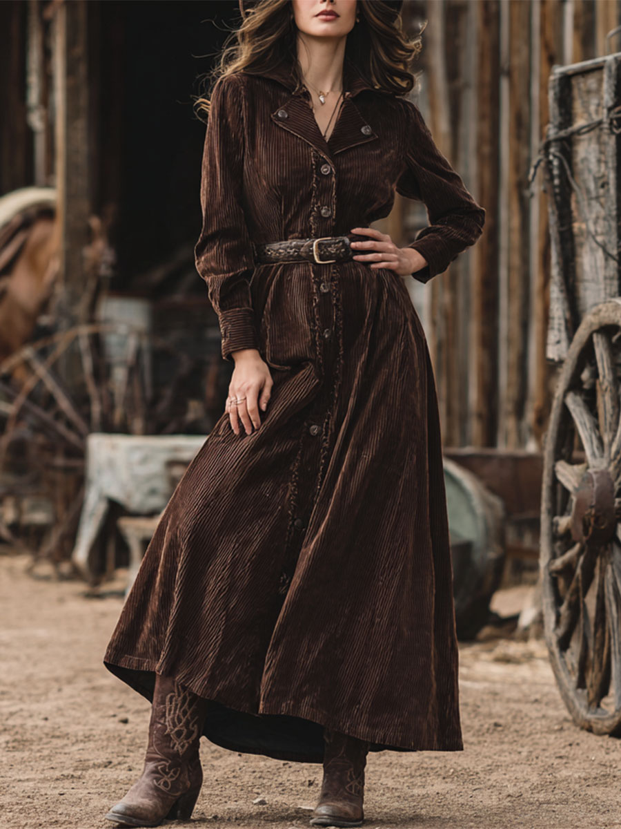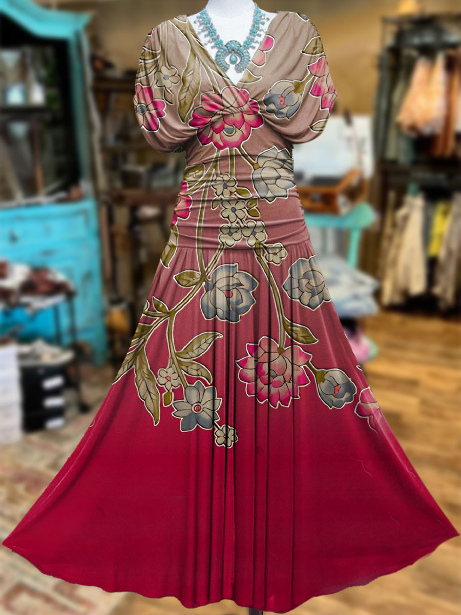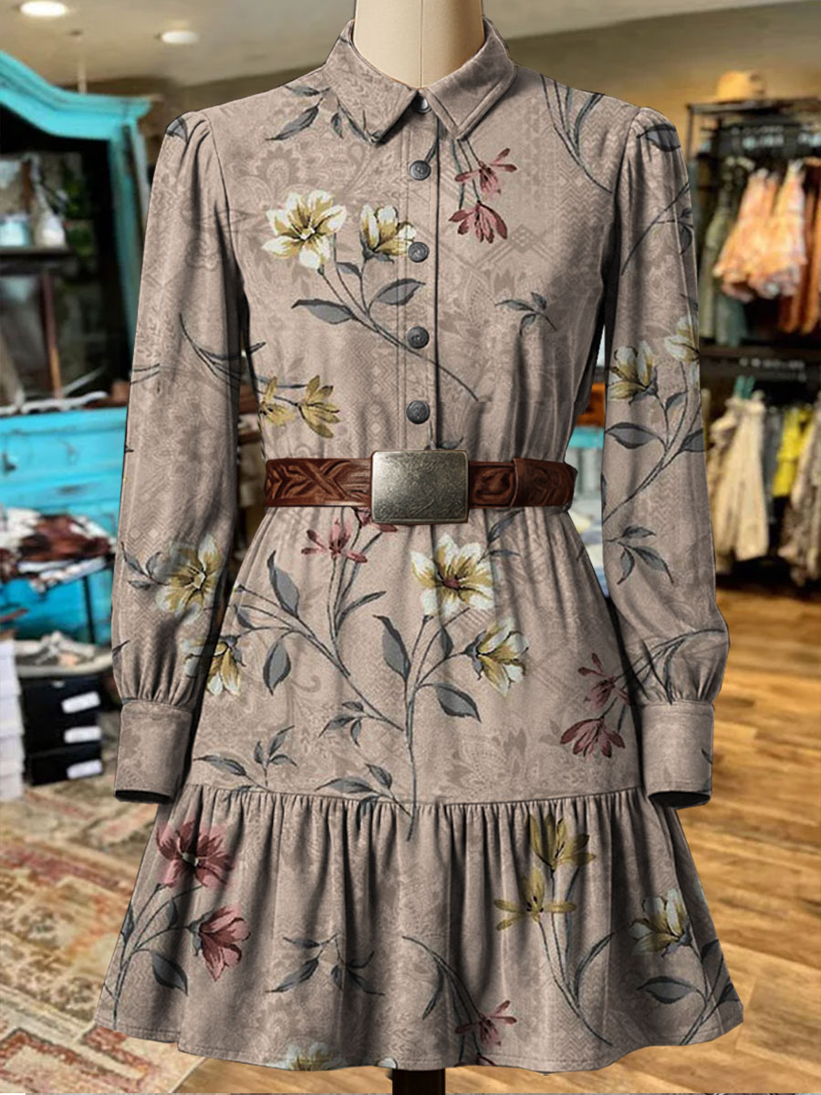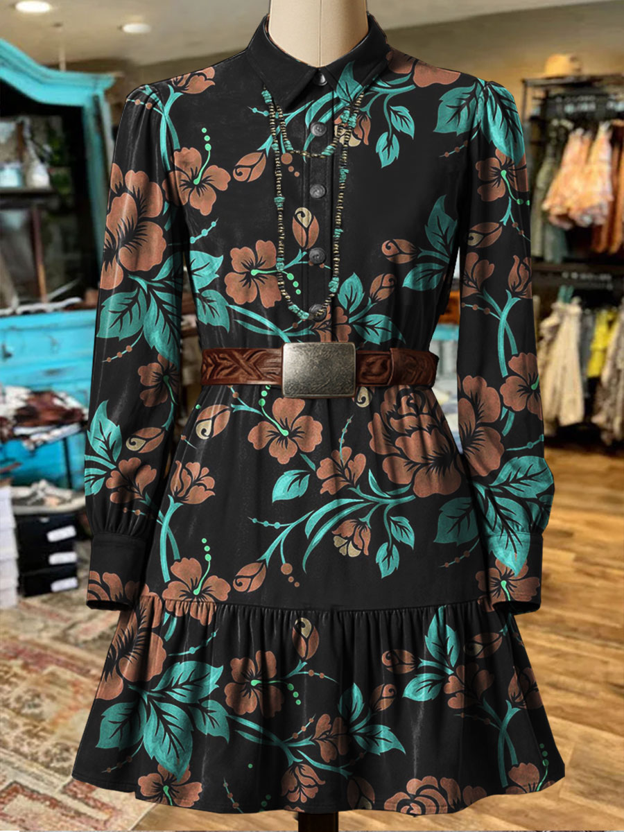 Vintage Floral Print Casual Long Sleeved Lapel Dress