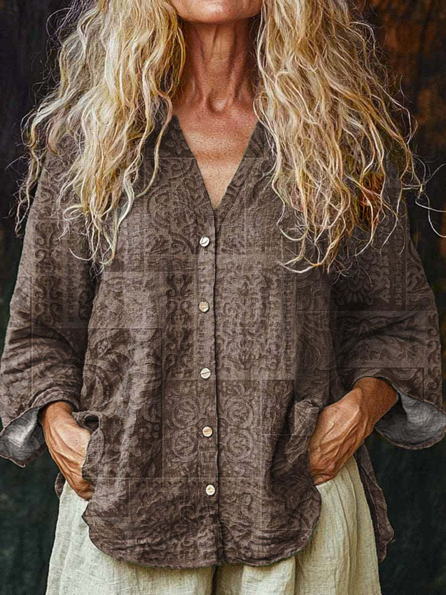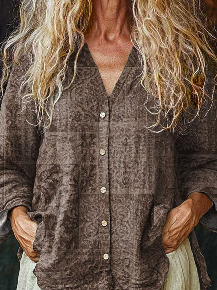 70s Vintage Style Pattern Printed Women's Linen And Cotton V-Neck Casual Shirt