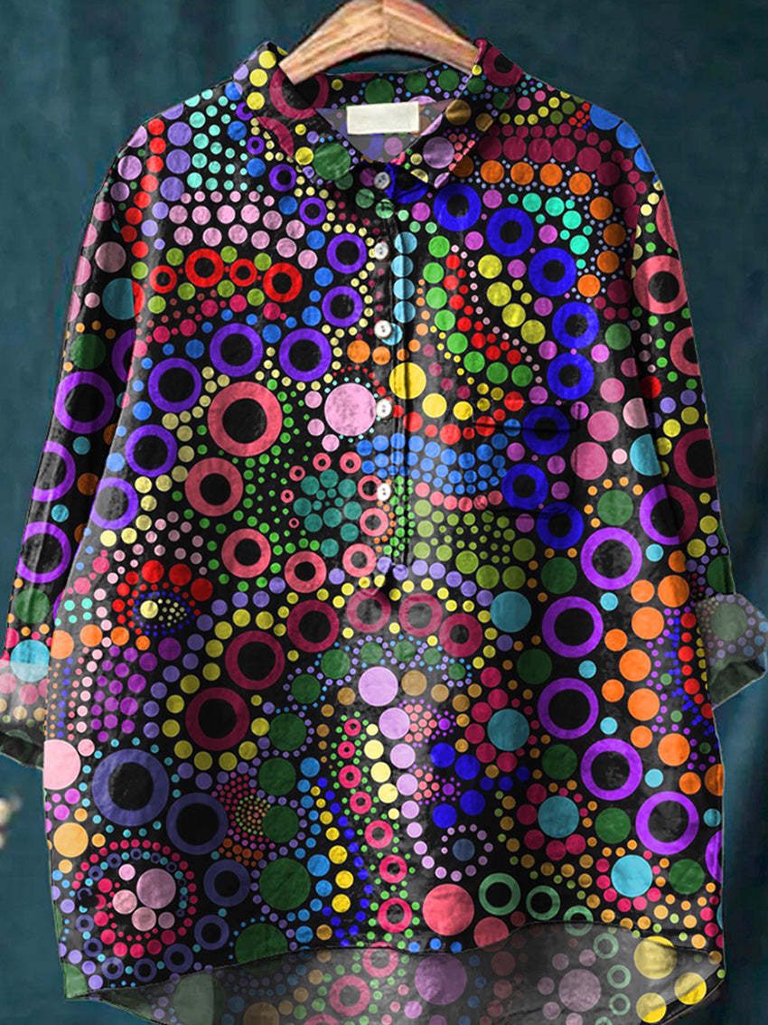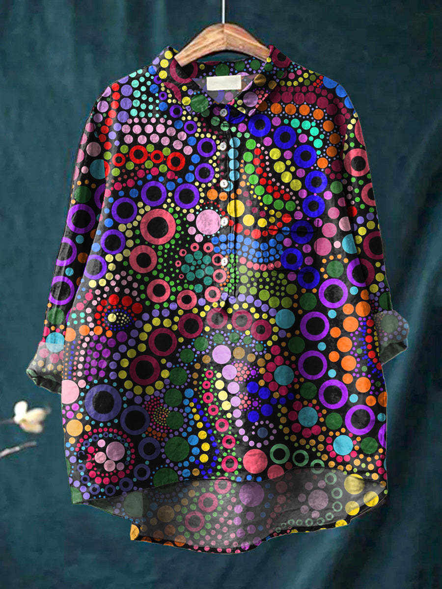 Abstract Geometric Circle Pattern Printed Women's Casual Cotton And Linen Shirt